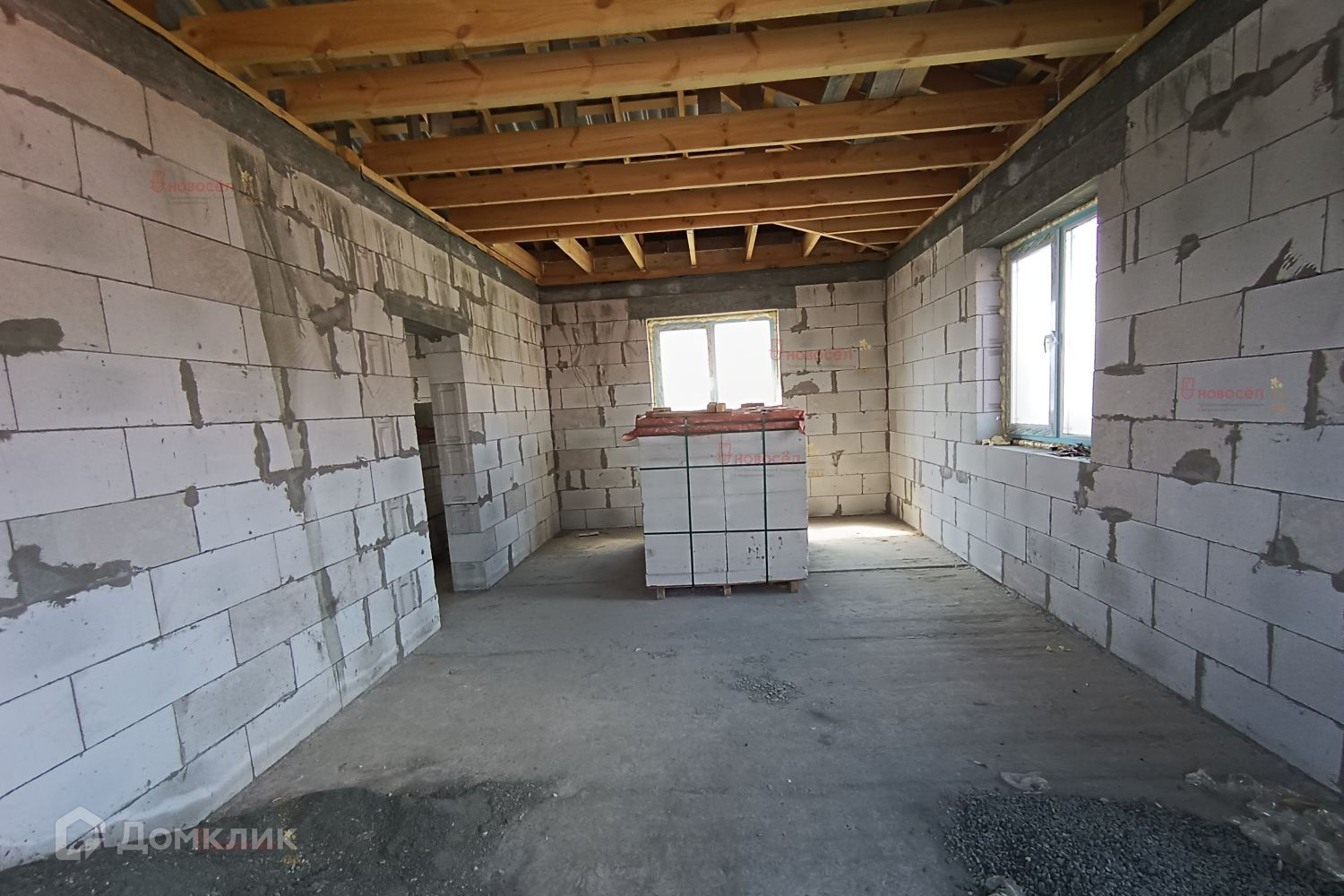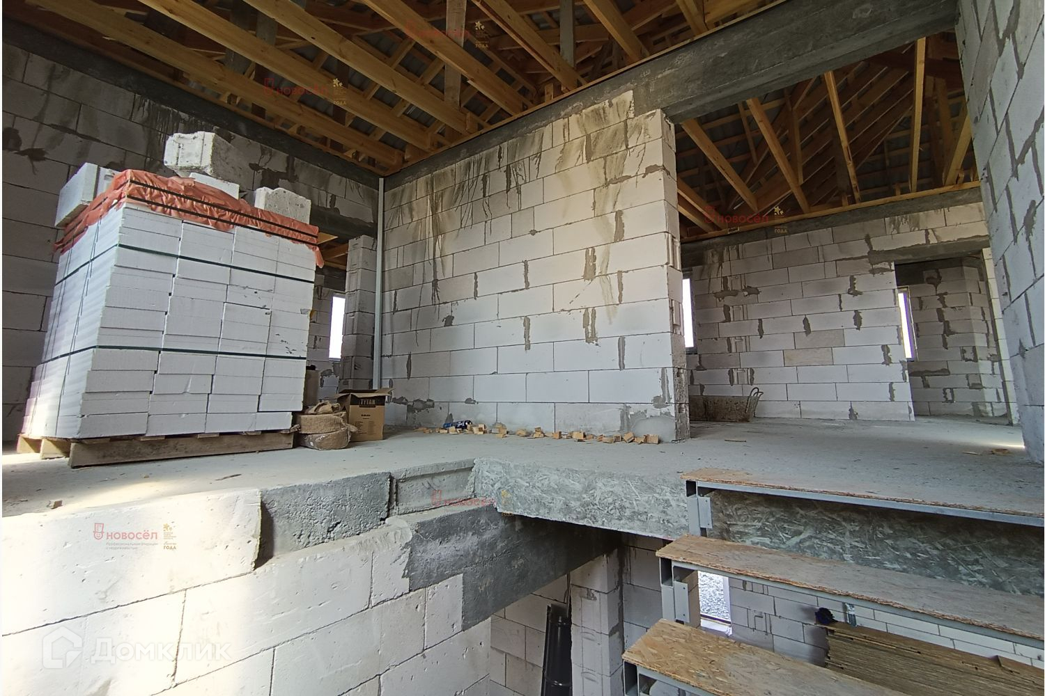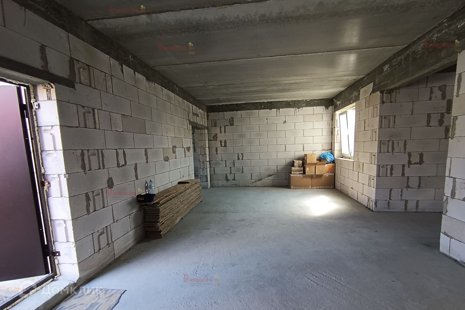 На первом этаже по проекту: гостиная-столовая 28 кв.м, спальная комната, 2 гардеробные, санузел, холл, гараж с бойлерной 42 кв.м. с выходом в дом и на задний двор. На потолке железобетонные перекрытия. Установлена лестница, по своему вкусу возможно доделать. Между этажами залит бетонный армопояс по всему периметру, на него уложены плиты перекрытия для прочного укрепления дома.