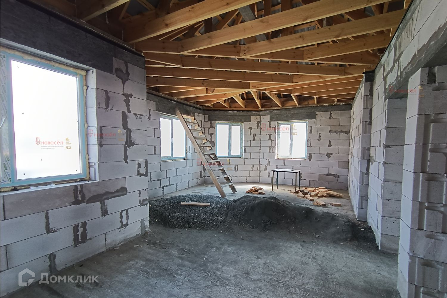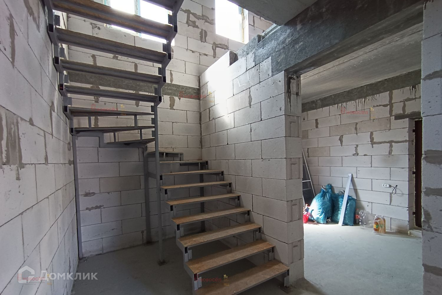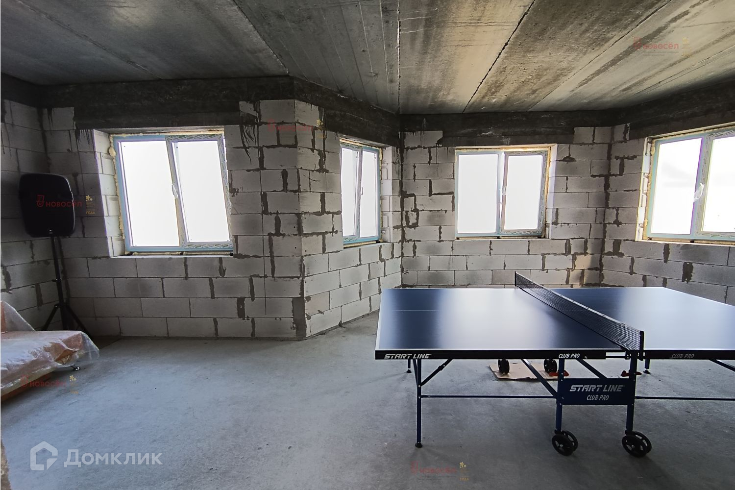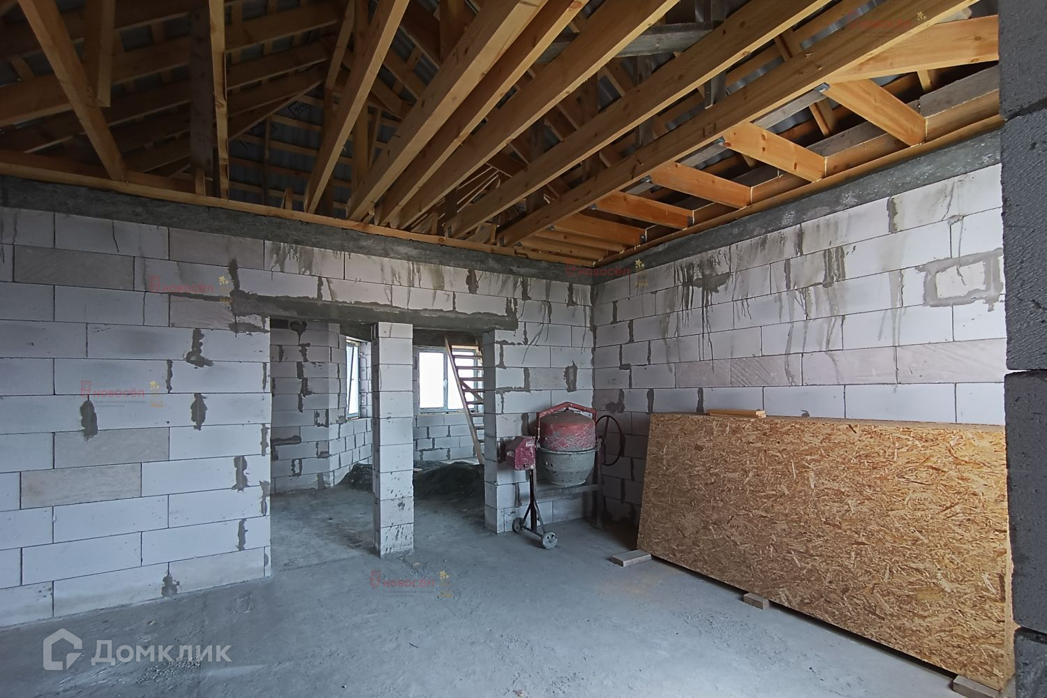 На первом этаже по проекту: гостиная-столовая 28 кв.м, спальная комната, 2 гардеробные, санузел, холл, гараж с бойлерной 42 кв.м. с выходом в дом и на задний двор. На потолке железобетонные перекрытия. Установлена лестница, по своему вкусу возможно доделать. Между этажами залит бетонный армопояс по всему периметру, на него уложены плиты перекрытия для прочного укрепления дома.