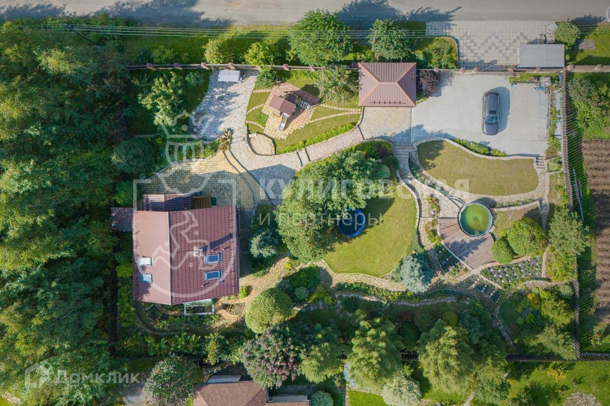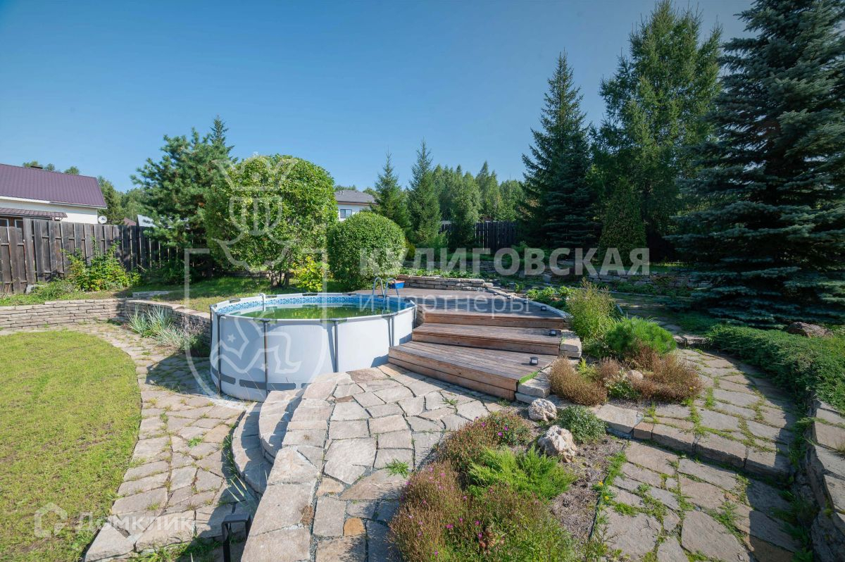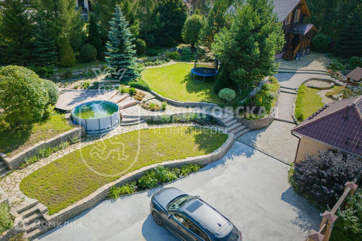 грамотно подобранные растения, всё сочетается по высоте, культуре и периодам цветения. Есть мини-сад с плодовыми деревьями и аккуратными грядками. Также на участке располагаются котельная, зона барбекю с печью и мангалом, детская площадка, каркасный бассейн с террасой для отдыха.