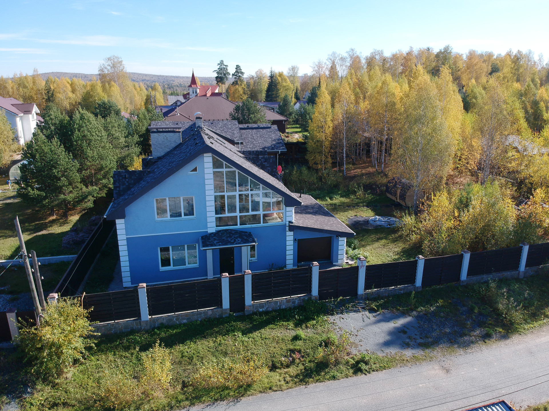 Капитальный забор с автоматическими воротами, сигнализация, телевиденье, интернет.