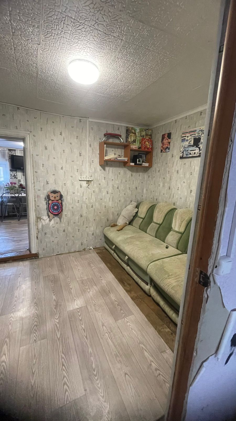 Деревянный,  крыша железная. 2 комнаты смежные и кухня - прихожая.