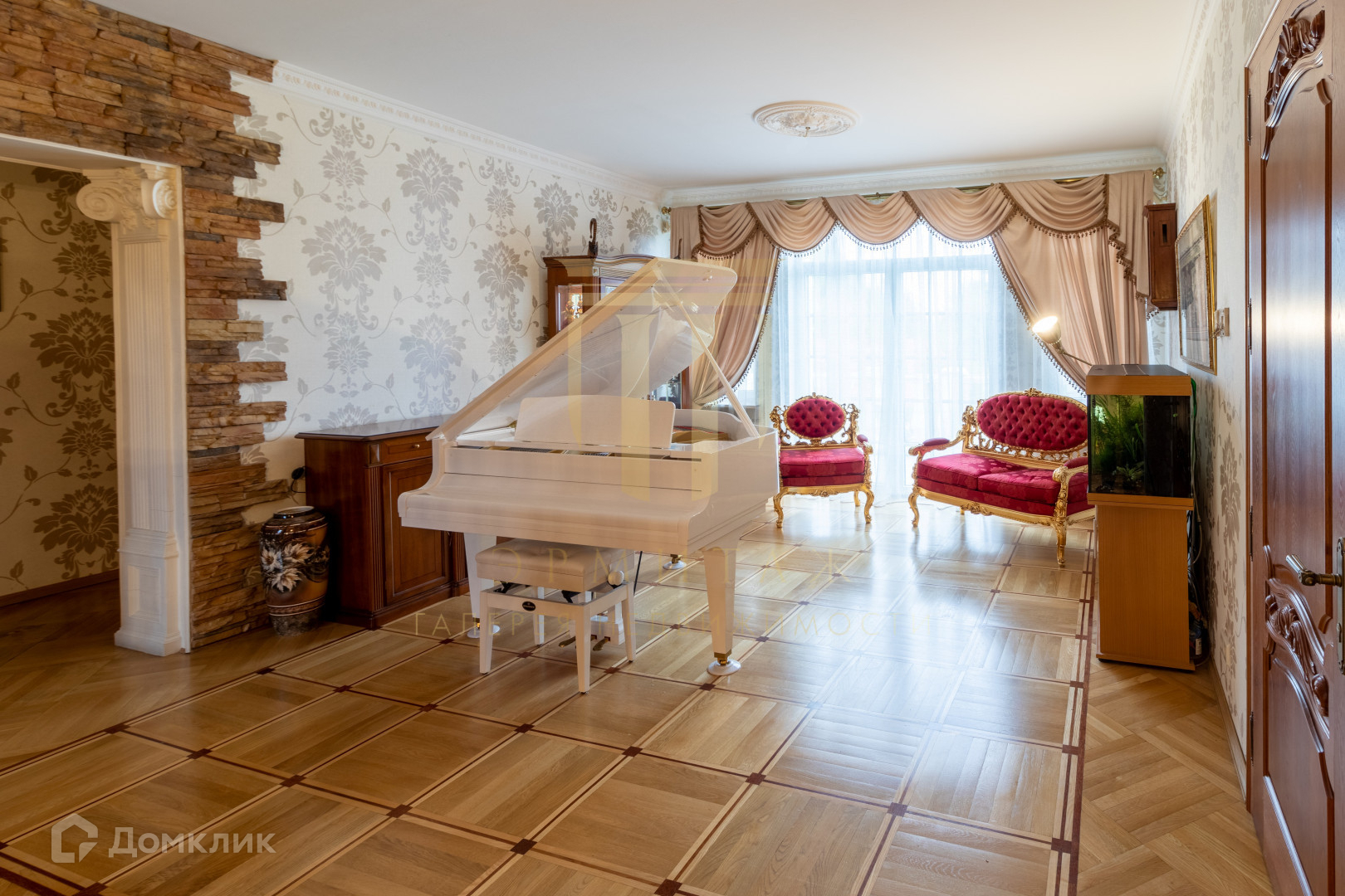 Мебель изготовлена из ценных пород дерева – ореха и вишни, подоконники отделаны натуральным мрамором. На полу деревянный паркет,