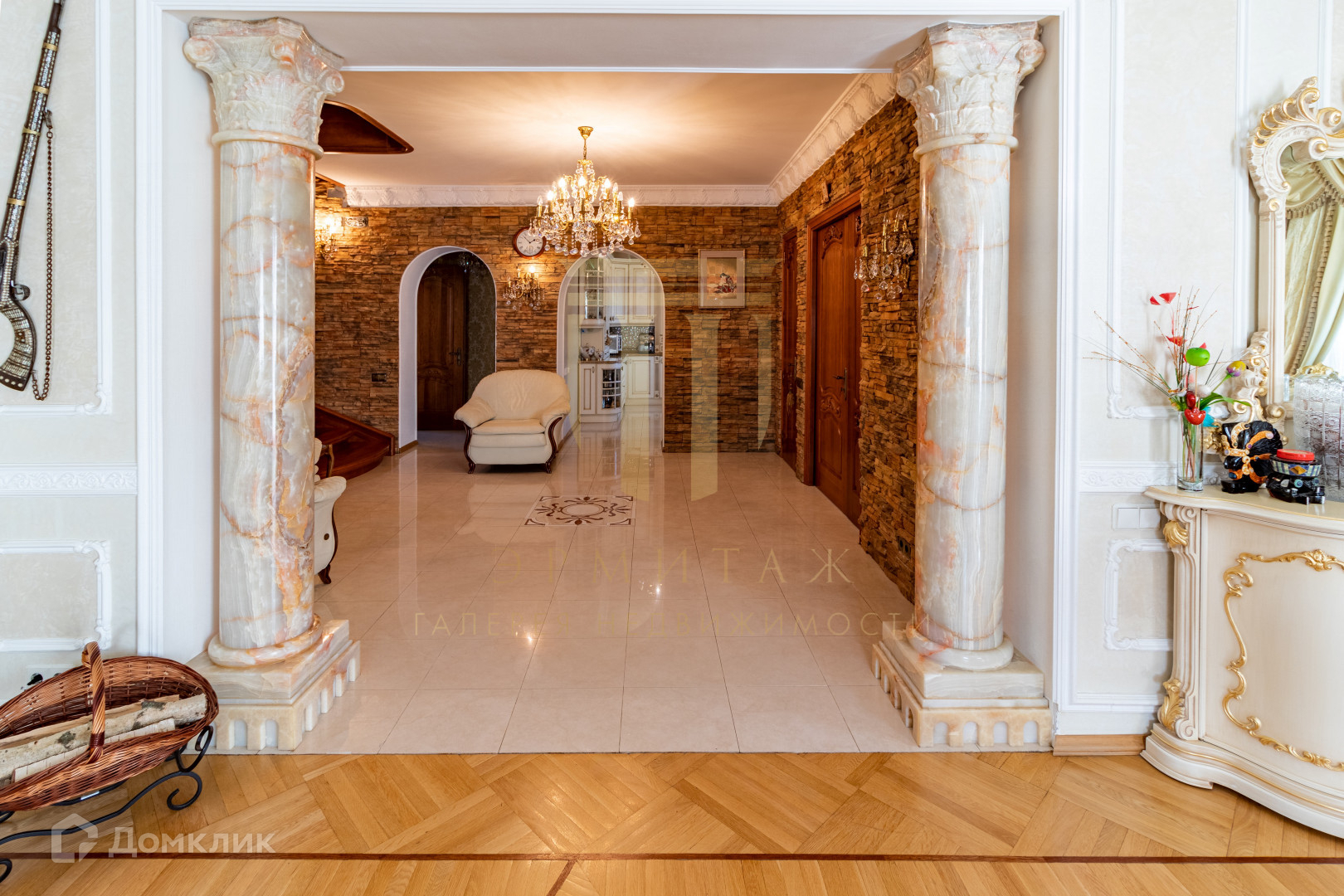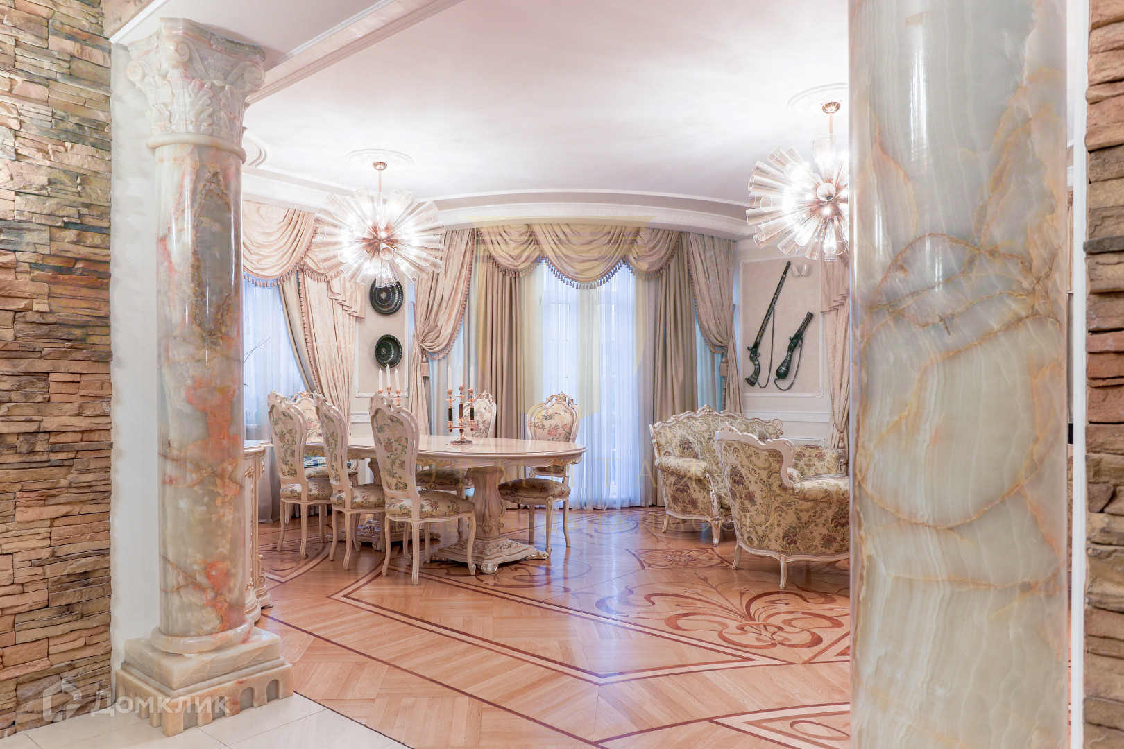 Непревзойденный шик и гармония нашли свое воплощение в дизайне гостиной, вход обрамлен двумя колоннами из цельного оникса, изготовленными по эксклюзивному дизайну. Светлая мебель из натурального дерева, мягкая мебель, обитая натуральным шелком, журнальный столик со столешницей из натурального оникса- все формирует атмосферу праздника для приема гостей;