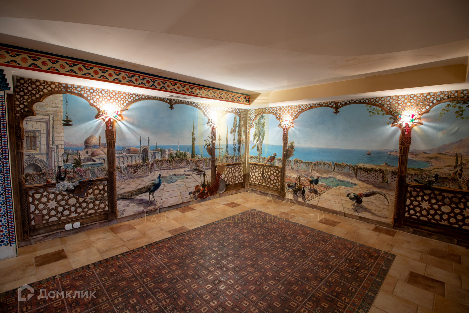 Все в интерьере воплощает единую концепцию: дизайн осветительных приборов, напольное покрытие, дизайн дверных полотен. Картина на стене с панорамой морского побережья переносит гостей в восточную сказку. Задумывалось это помещение как бильярдная, но возможности его использования остаются на усмотрение будущих хозяев.
