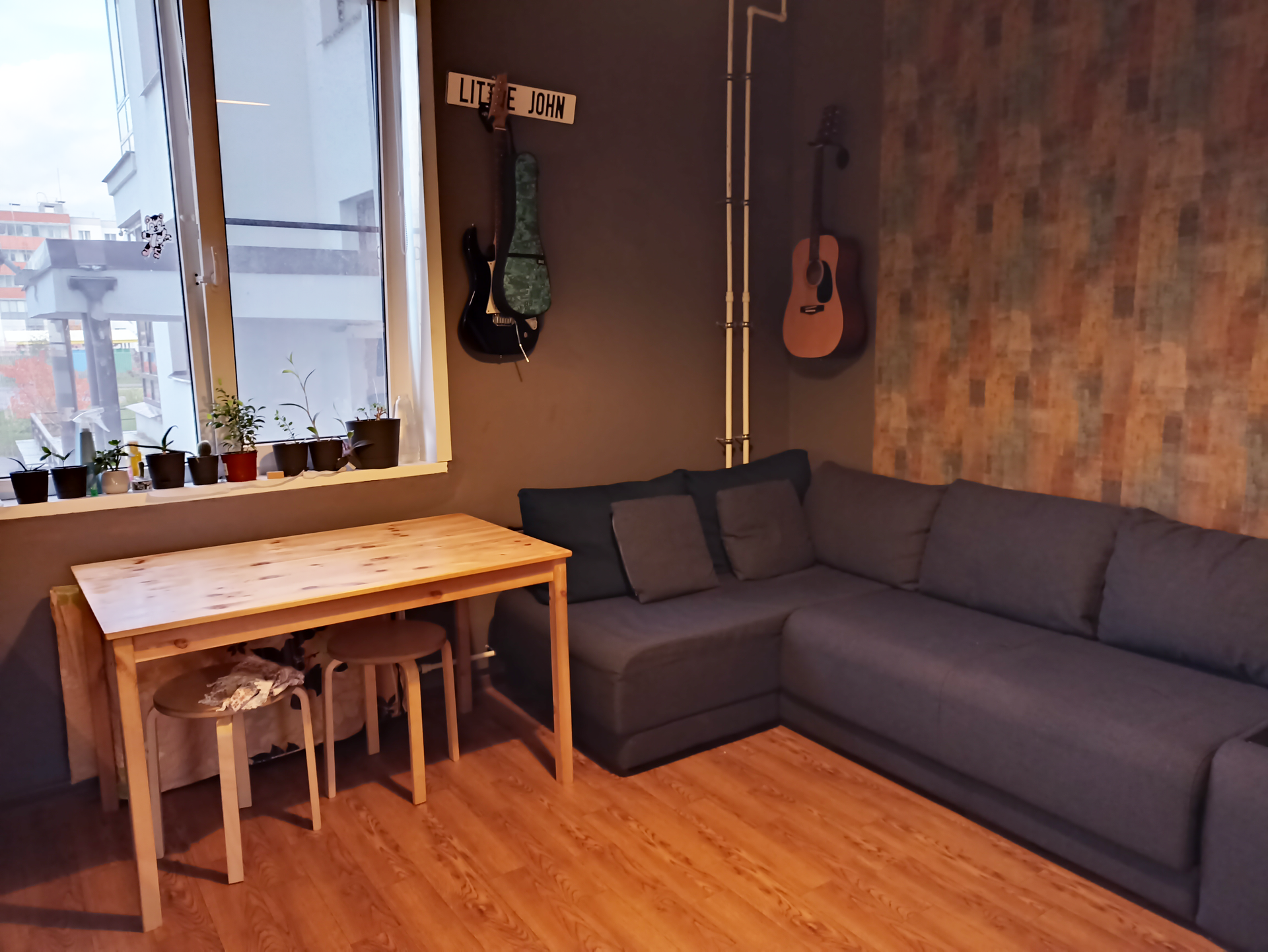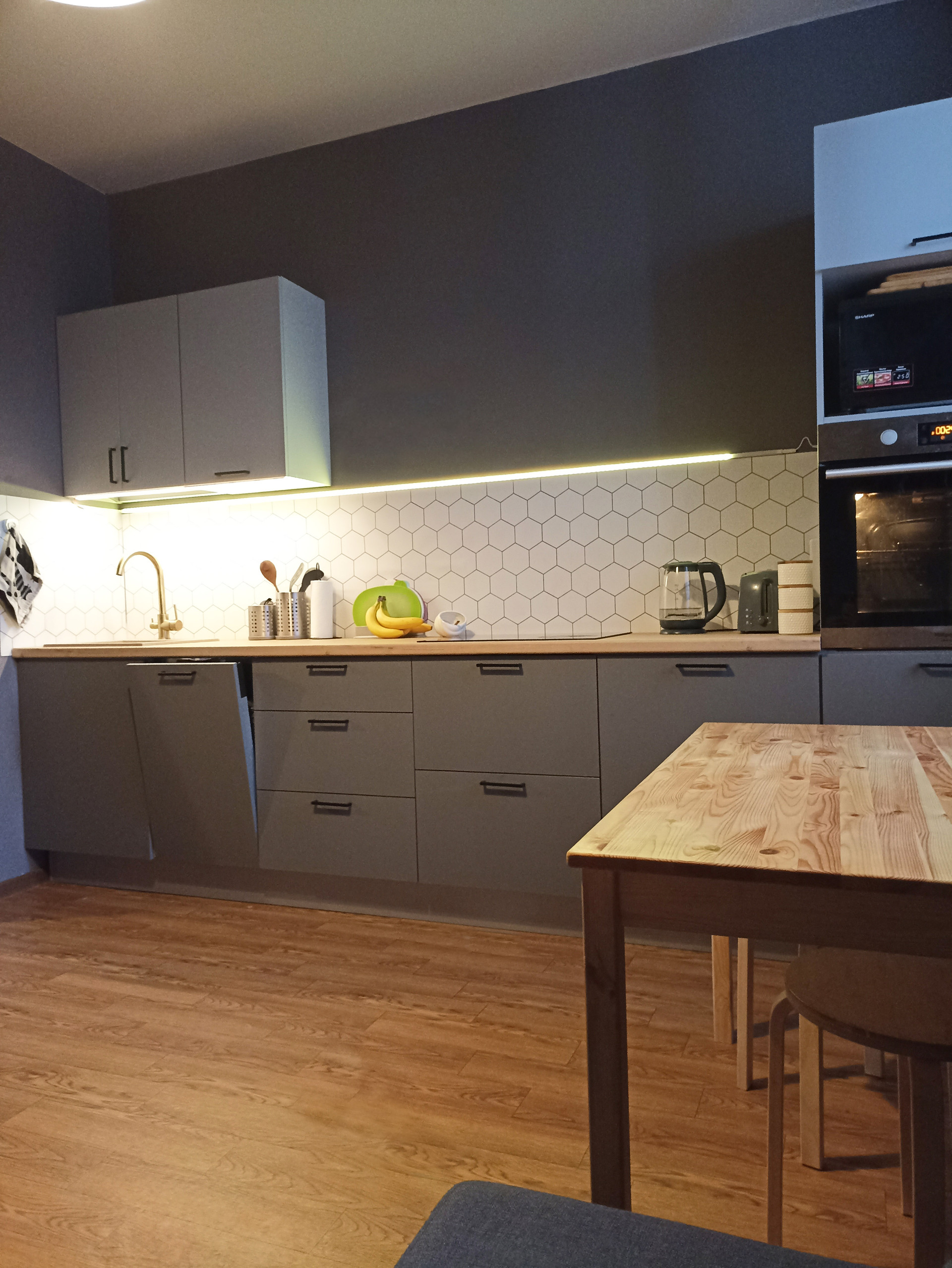 В кухне за большим столом могут комфортно разместиться до 12-14 человек. Двуспальный угловой диван хорошо вписывается в интерьер и не скрадывает пространство.