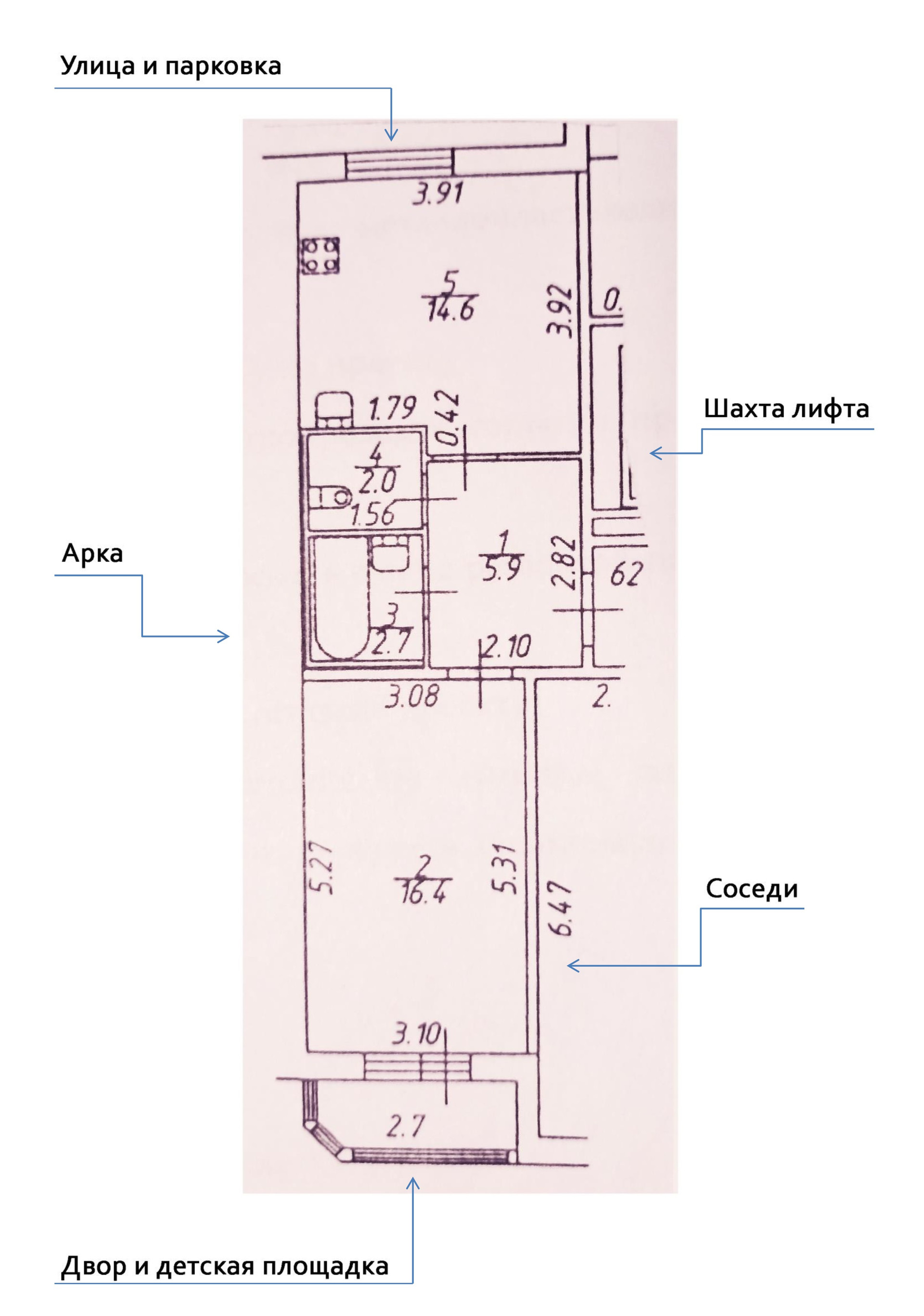 Большие комнаты: жилая (16,4 м2) и кухня (14,6 м2).