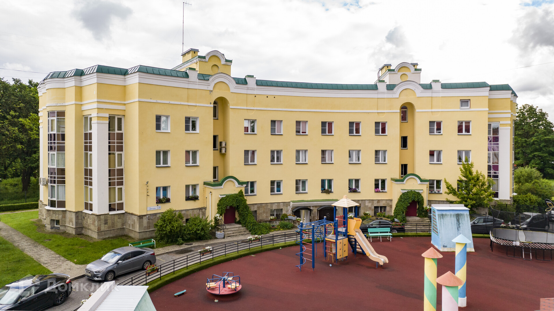 Зеленый охраняемый двор с беседкой для барбекю, детской игровой площадкой, подземным паркингом и собственной калиткой в Александрийский парк.