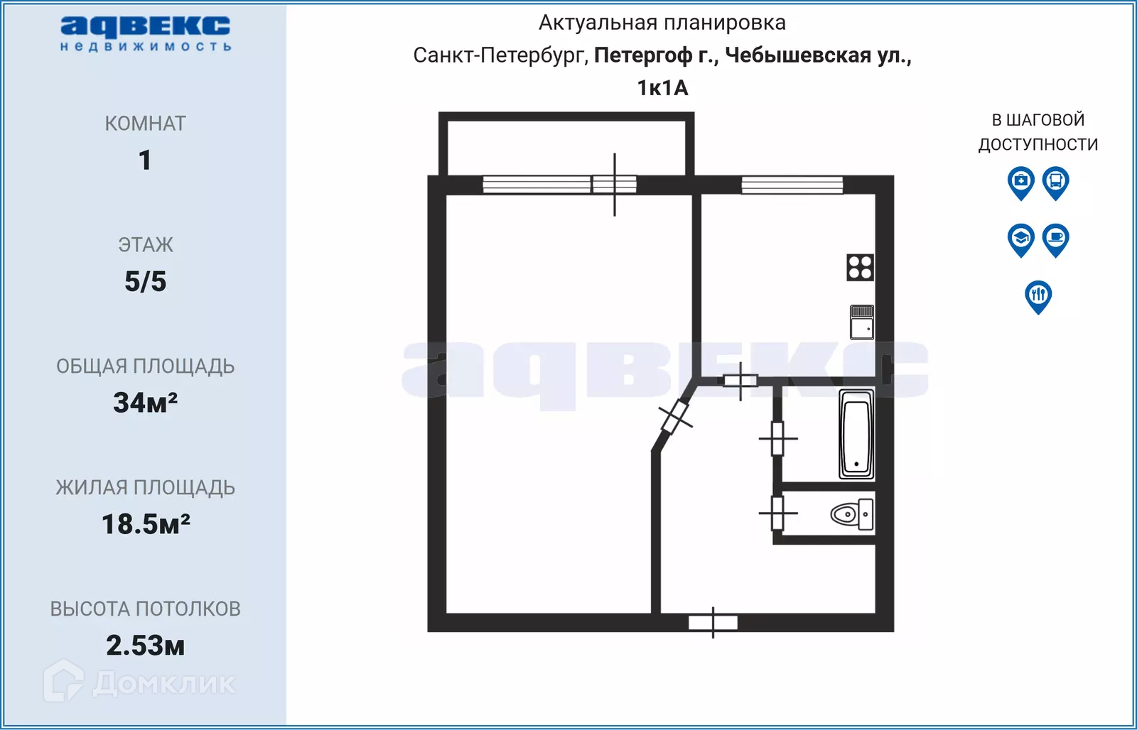 В Петродворцовом районе продается чистая, светлая 1-комн. квартира, 34 кв.