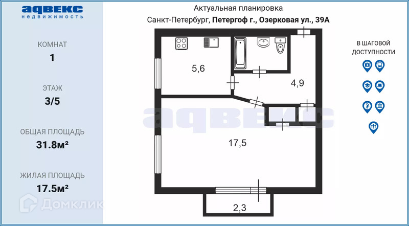 1-комнатная квартира, 31.8 м2, этаж 3 / 5, на продажу в Петергофе, Озерковая улица, 39