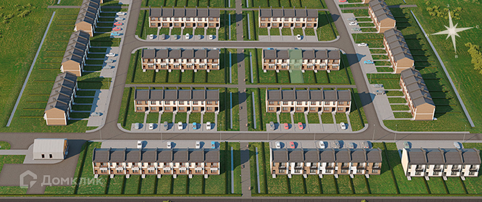- Парковочные зоны на 2 машино-места для каждой секции таунхаусов