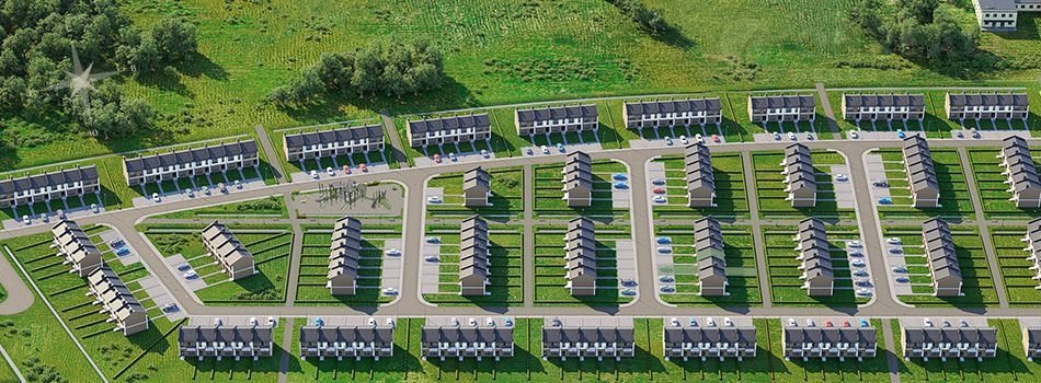 — парковочные зоны на 2 машино-места для каждой секции таунхаусов;