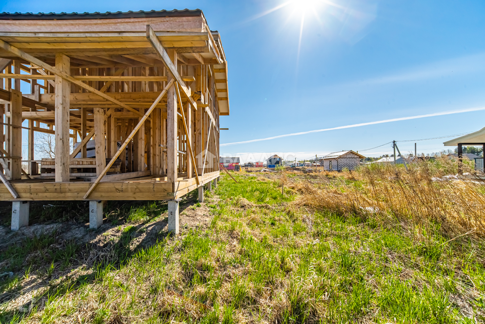 Фундамент дома - свайный, каркас - из бруса дерева. Дом готов под крышу. само дерево с пропиткой.