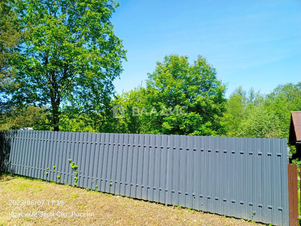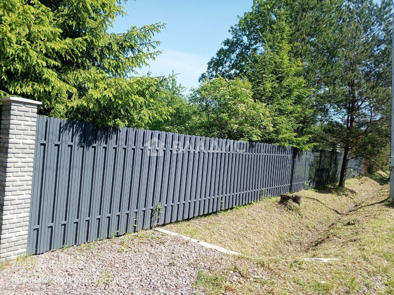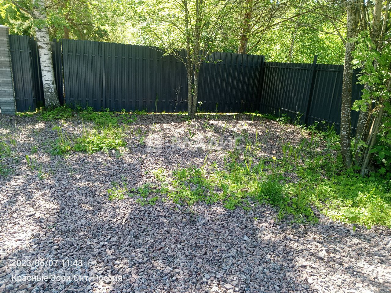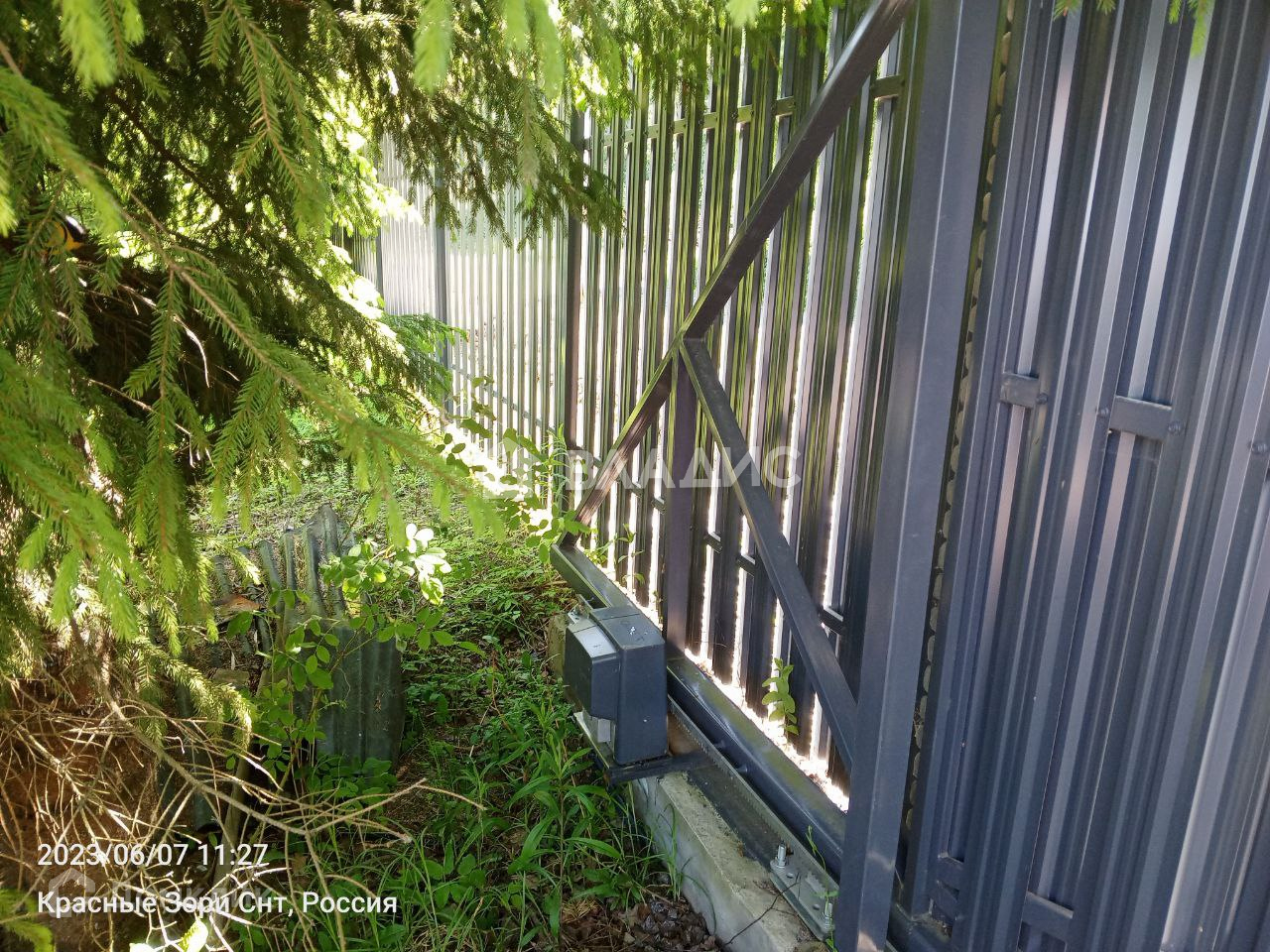 С трех сторон огорожен забором, откатные ворота, с четвертой стороны протекает речка, никогда не пересыхает.