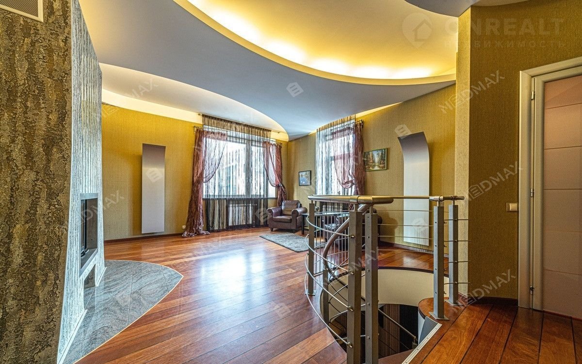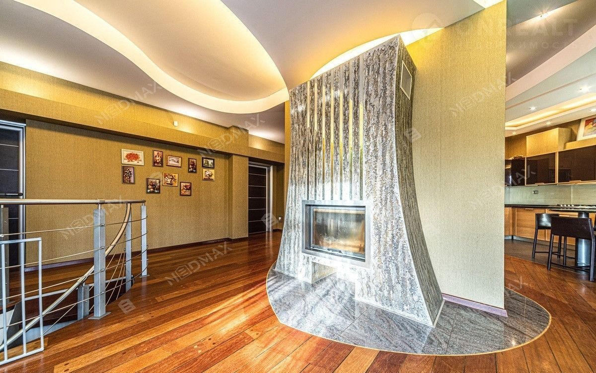 На верхнем уровне находится просторная кухня оборудованная всей необходимой техникой. Столовая зона и гостиная разделены действующим камином. Также на нём находятся три спальные комнаты. Гостевой санузел и небольшая гардеробная. В мастер-спальне расположен санузел с туалетом и большой ванной.