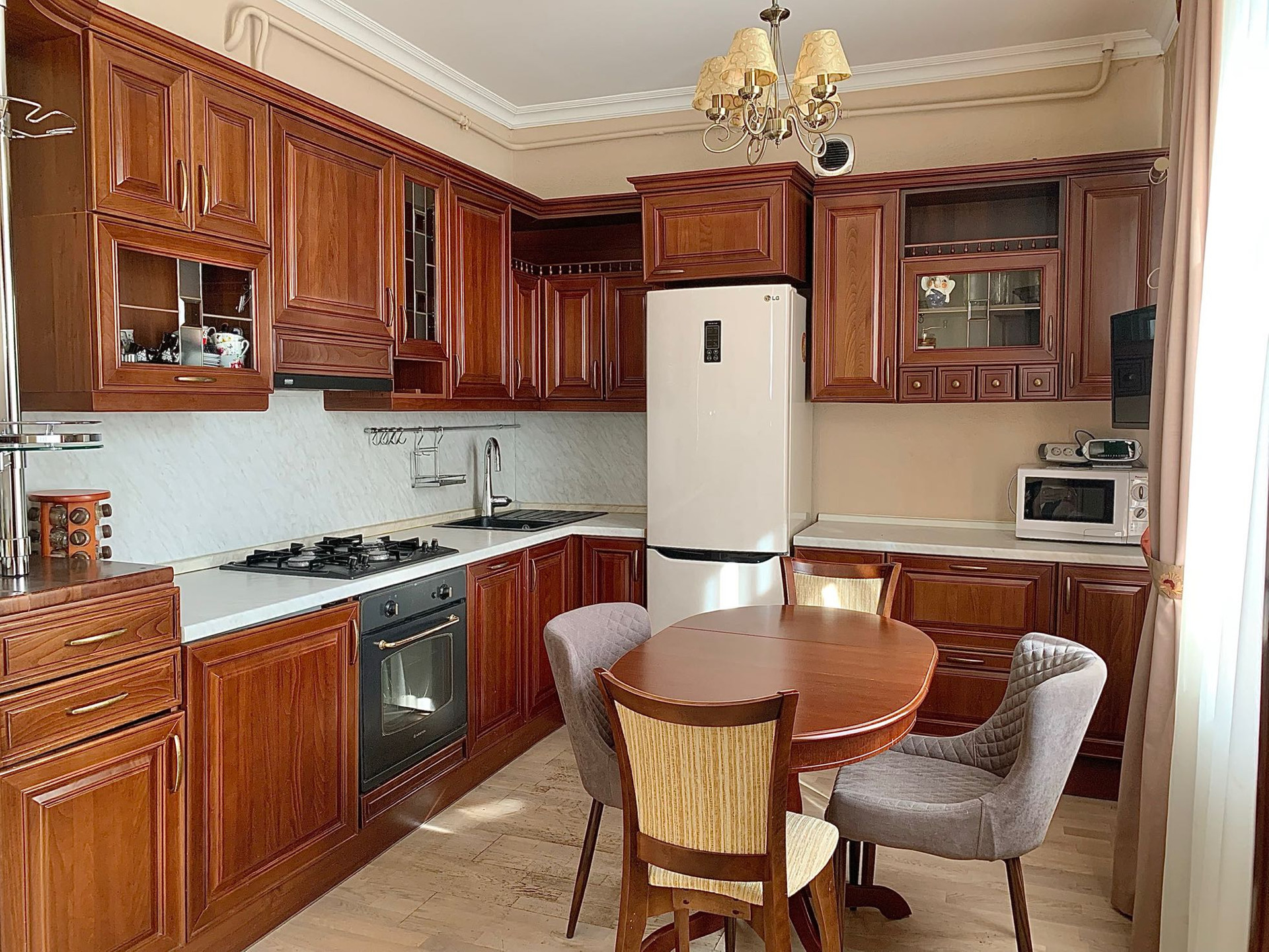 • На кухне установлена посудомоечная и стиральная машины, микроволновка, холодильник.