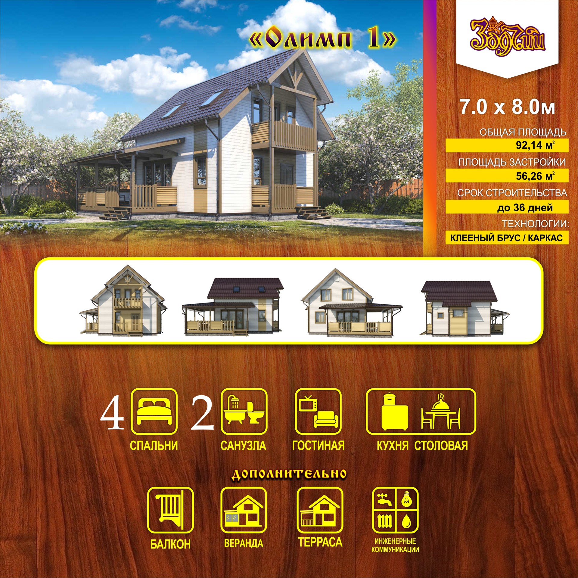 "Олимп 1" - отличное решение для большой семьи. При скромной площади застройки этот дом предоставит своим владельцам внушительный набор помещений: 4 спальни, одна из которых находится на первом этаже, 2 с/у и просторную столовую-гостиную, объединенную в общую зону. Удобная двухмаршевая лестница убрана в отдельный объем и не отнимает полезной площади.