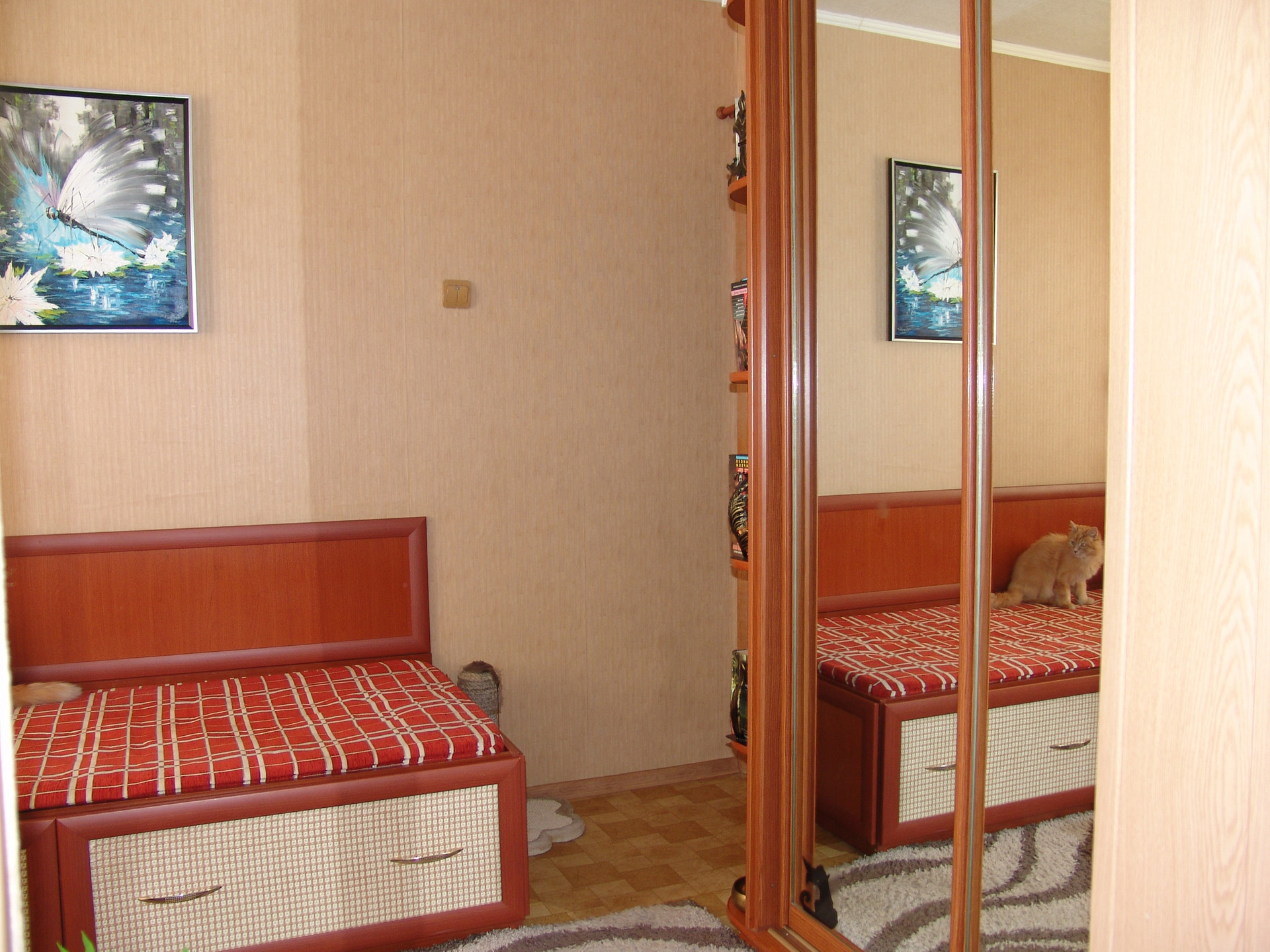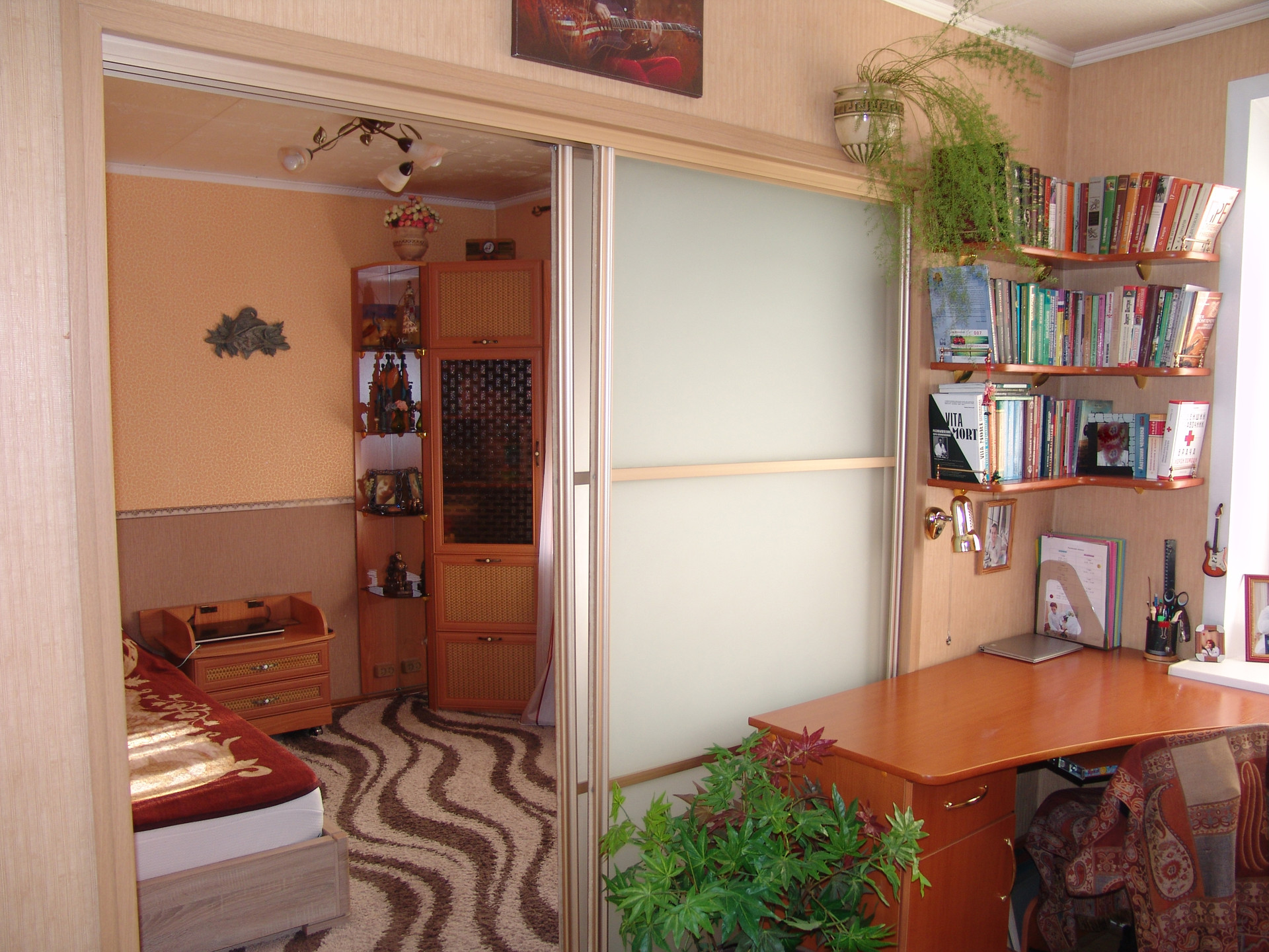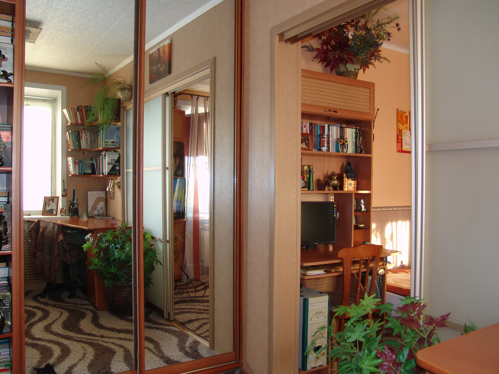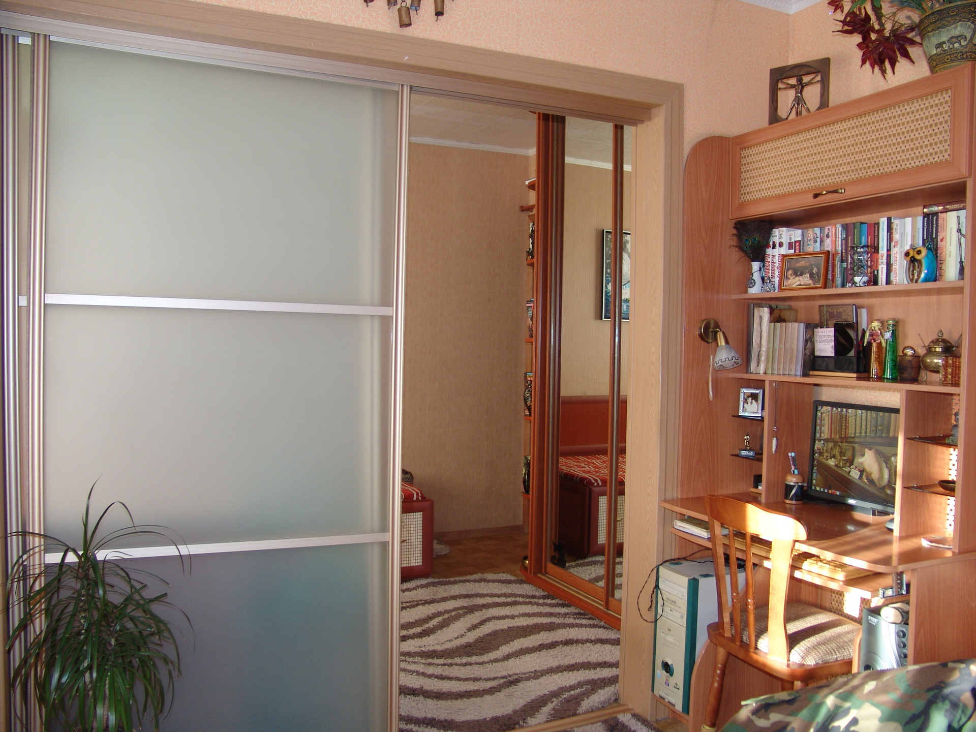 Квартира в середине, солнечная, теплая, ухоженная. Состояние очень хорошее, ремонт не нужен, все коммуникации работают без нареканий, никаких работ не требуется. Окна – пластик, металлическая входная дверь, межкомнатные двери – натуральный шпон и немецкая фурнитура, интернет, бойлер, ИПУ и пр. необходимые вещи в наличии. Санузел совмещенный, в кафеле. Но главное достоинство квартиры - это встроенная мебель. Изготавливалась по инд. проекту и заказу, дорого, поэтому эффективно использован каждый сантиметр полезной площади. Максимальное количество мест хранения и рационально организованное жилое пространство. Мебель является неотъемлемой частью квартиры, остается полностью и поэтому входит в стоимость. Комната зонирована на 2 части раздвижной перегородкой, проектировалось как спальня и кабинет (или детская). В каждой части имеется полноценное спальное и рабочее место. Смотрите фото.