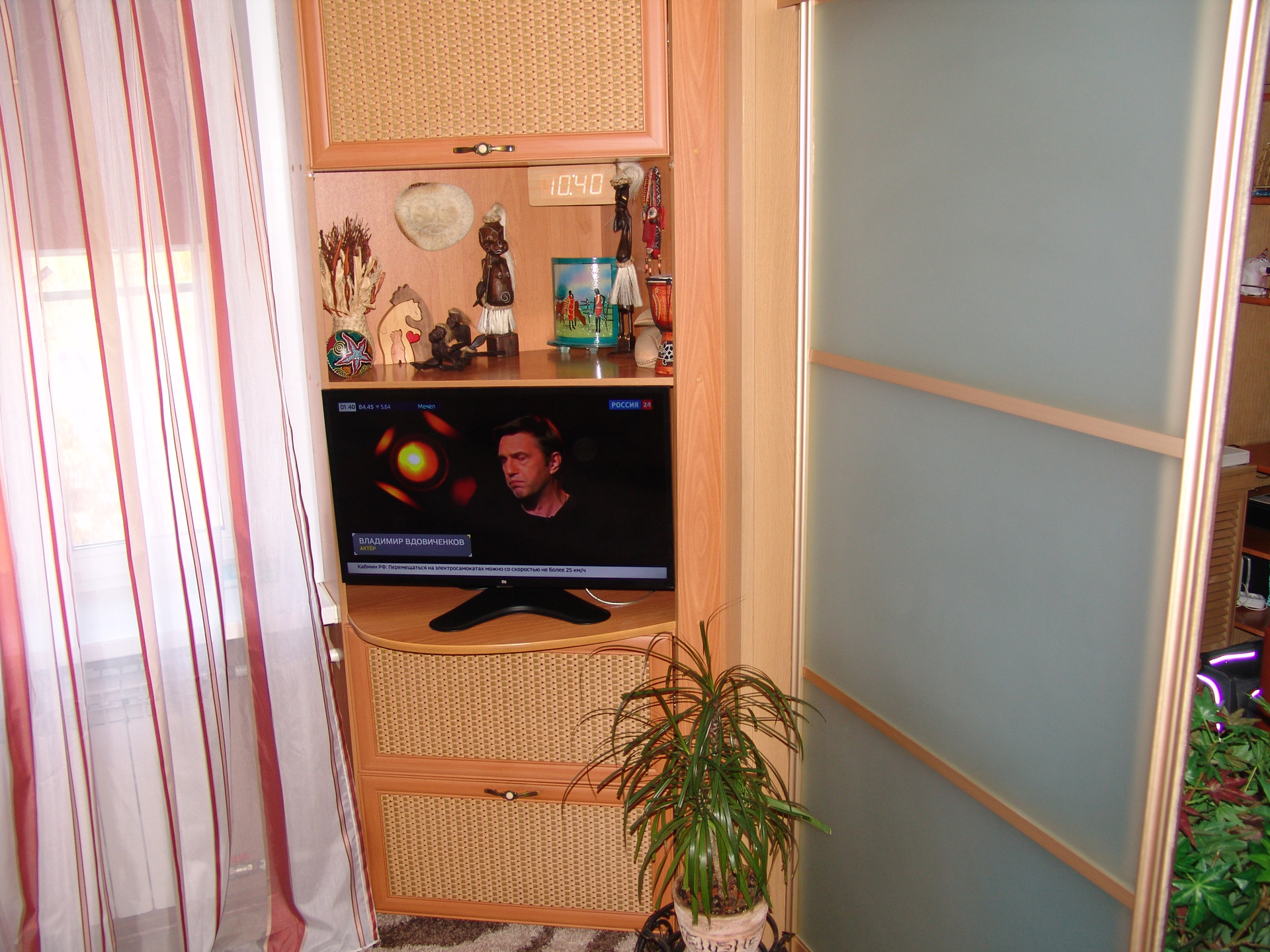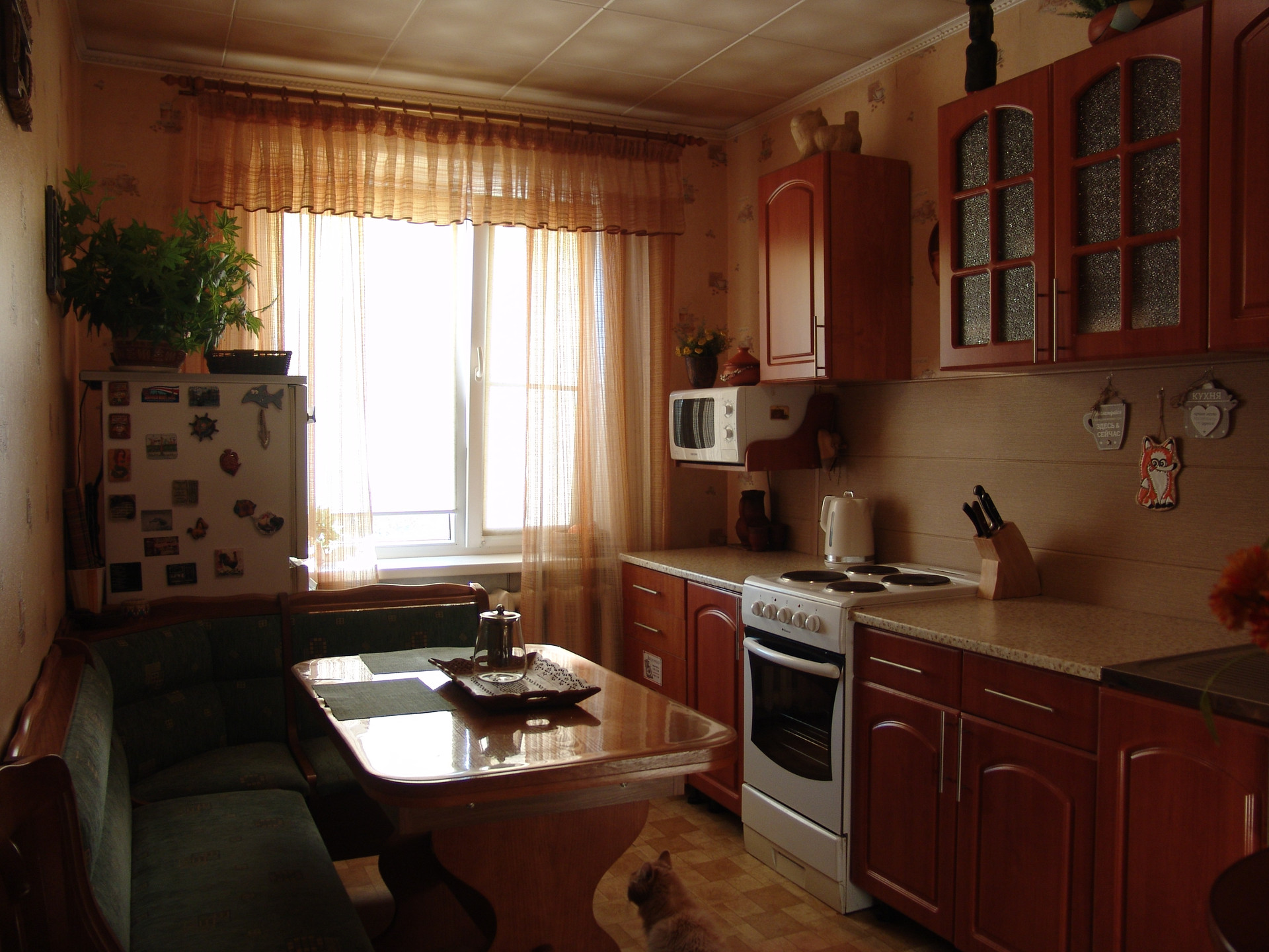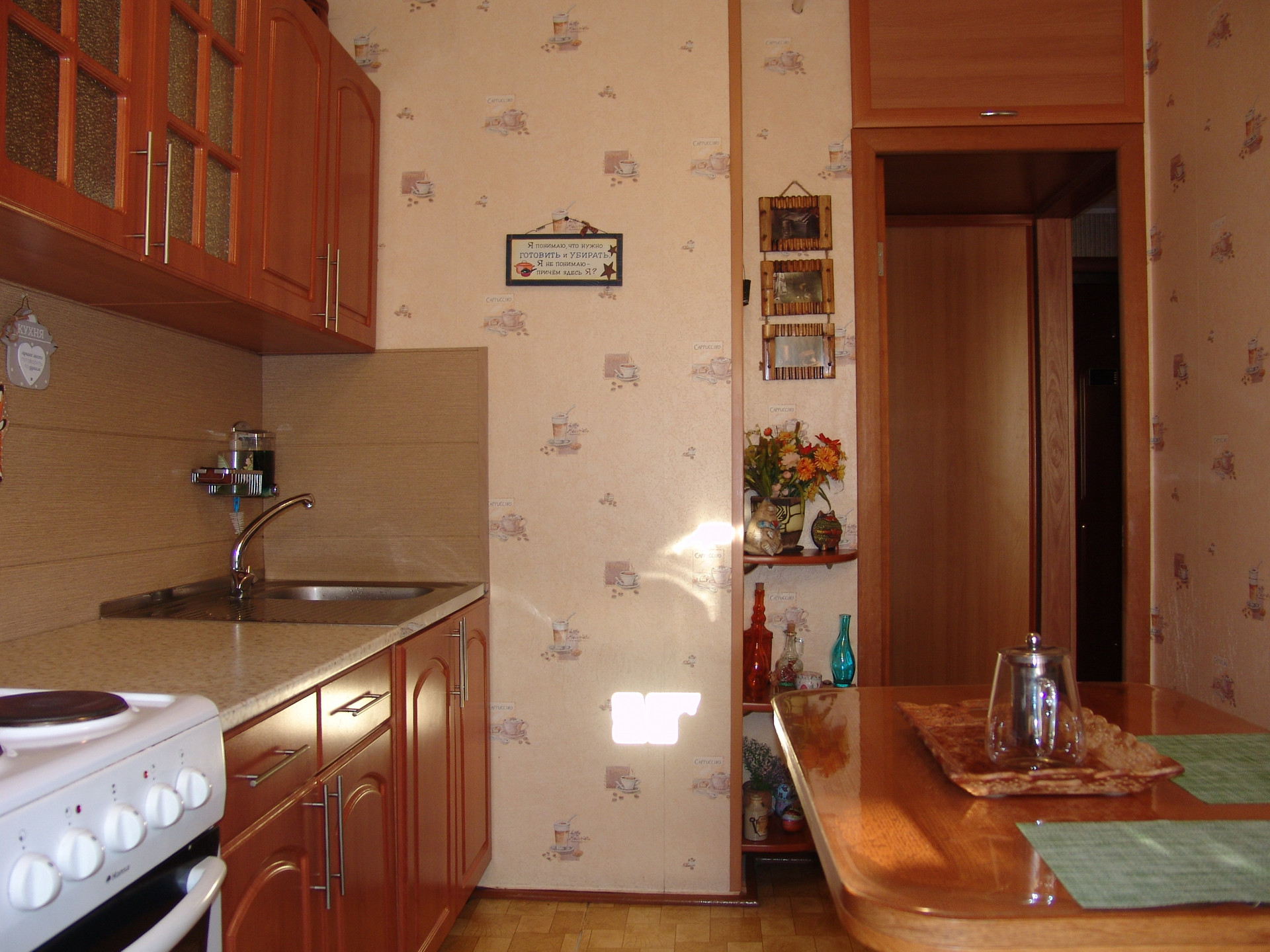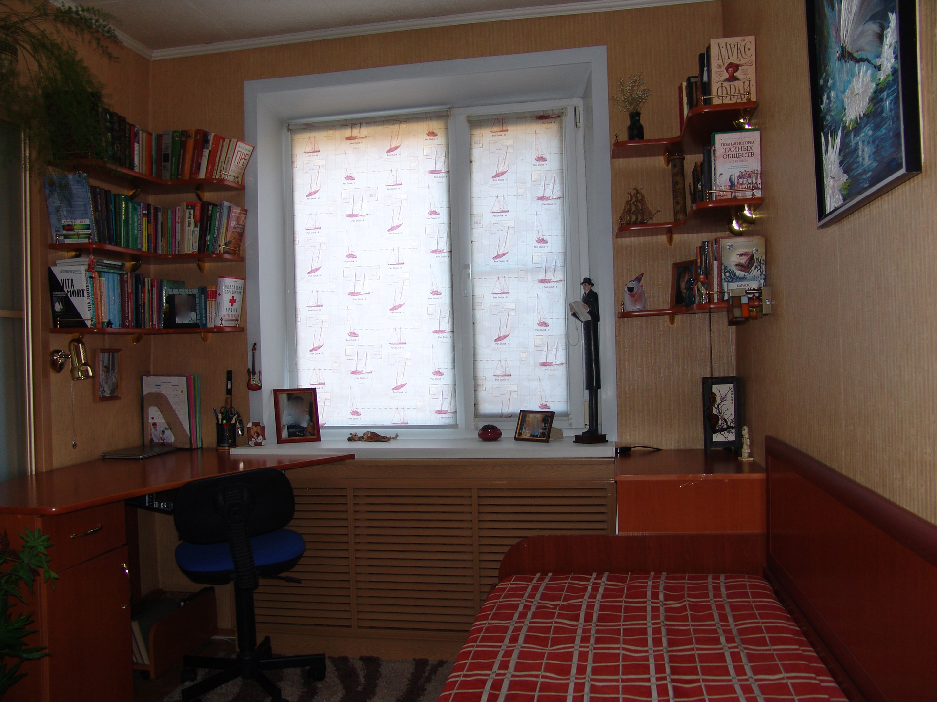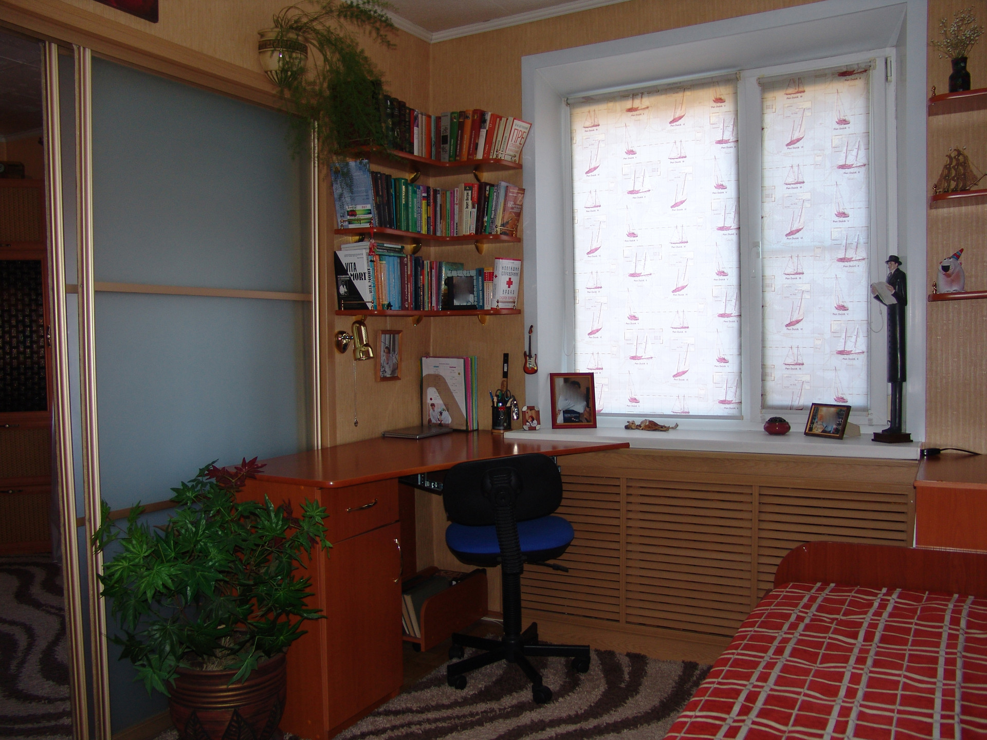 Квартира в середине, солнечная, теплая, ухоженная. Состояние очень хорошее, ремонт не нужен, все коммуникации работают без нареканий, никаких работ не требуется. Окна – пластик, металлическая входная дверь, межкомнатные двери – натуральный шпон и немецкая фурнитура, интернет, бойлер, ИПУ и пр. необходимые вещи в наличии. Санузел совмещенный, в кафеле. Но главное достоинство квартиры - это встроенная мебель. Изготавливалась по инд. проекту и заказу, дорого, поэтому эффективно использован каждый сантиметр полезной площади. Максимальное количество мест хранения и рационально организованное жилое пространство. Мебель является неотъемлемой частью квартиры, остается полностью и поэтому входит в стоимость. Комната зонирована на 2 части раздвижной перегородкой, проектировалось как спальня и кабинет (или детская). В каждой части имеется полноценное спальное и рабочее место. Смотрите фото.