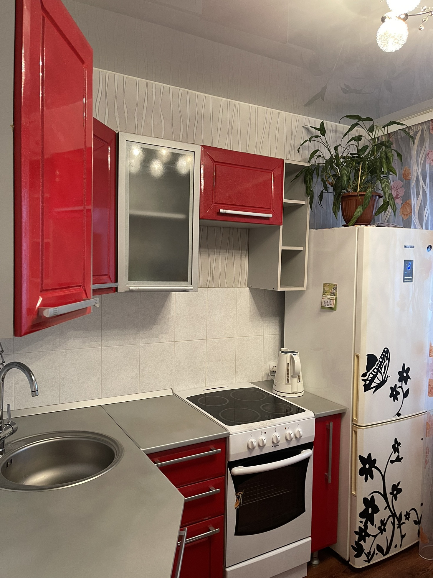 Натяжные потолки, хорошое обои, ламинат на полу, чистая без посторонних запахов квартира.
