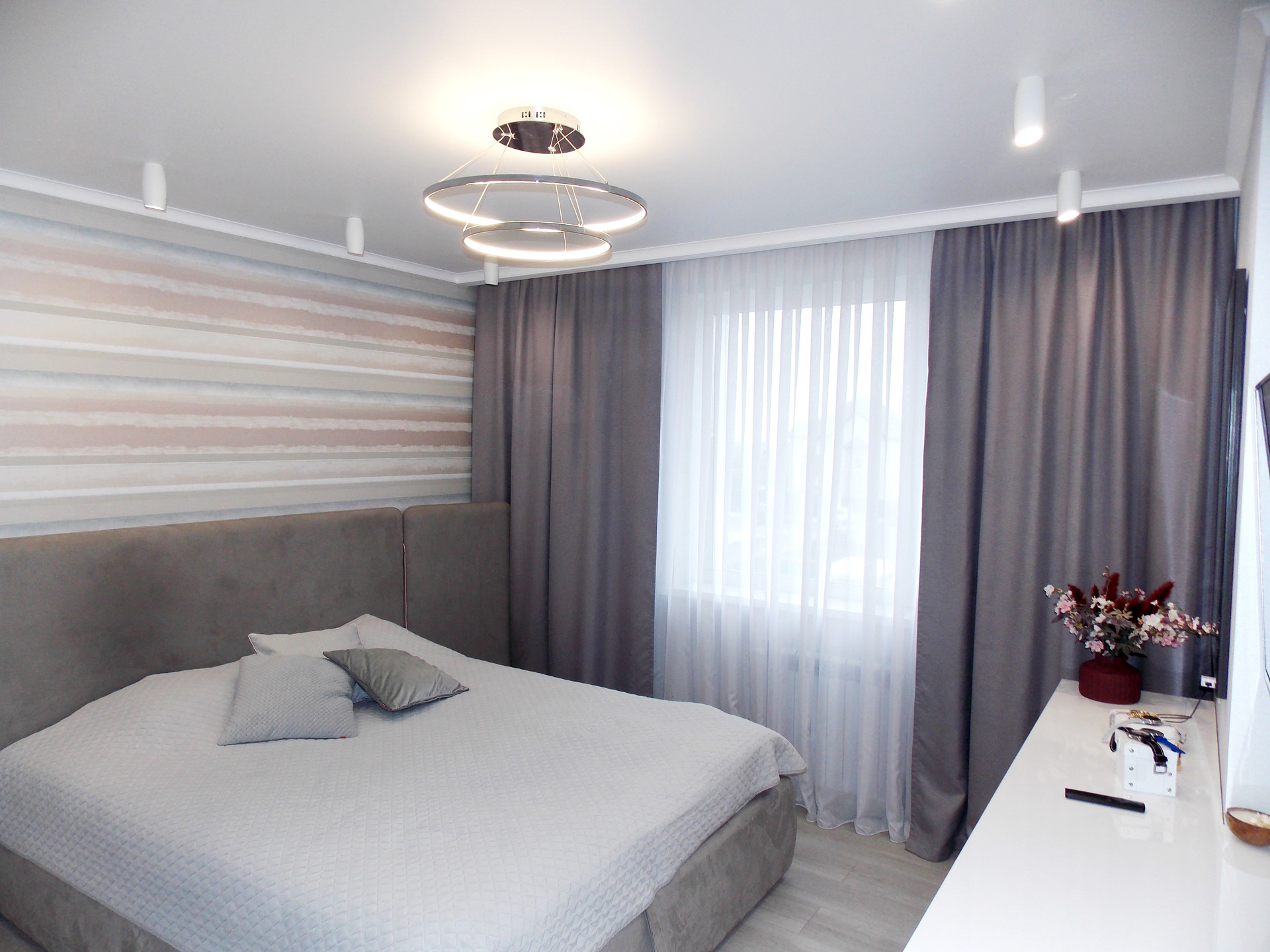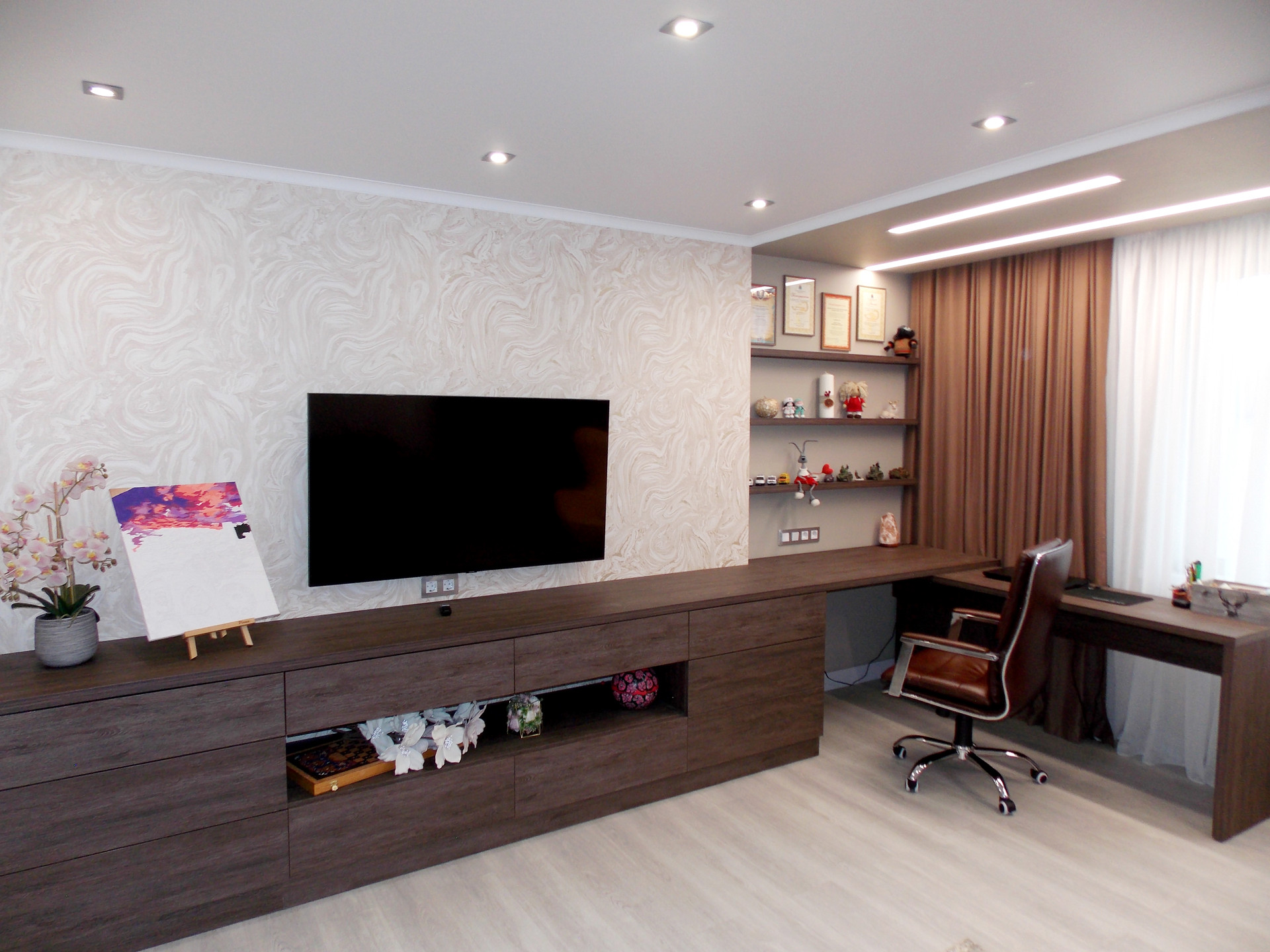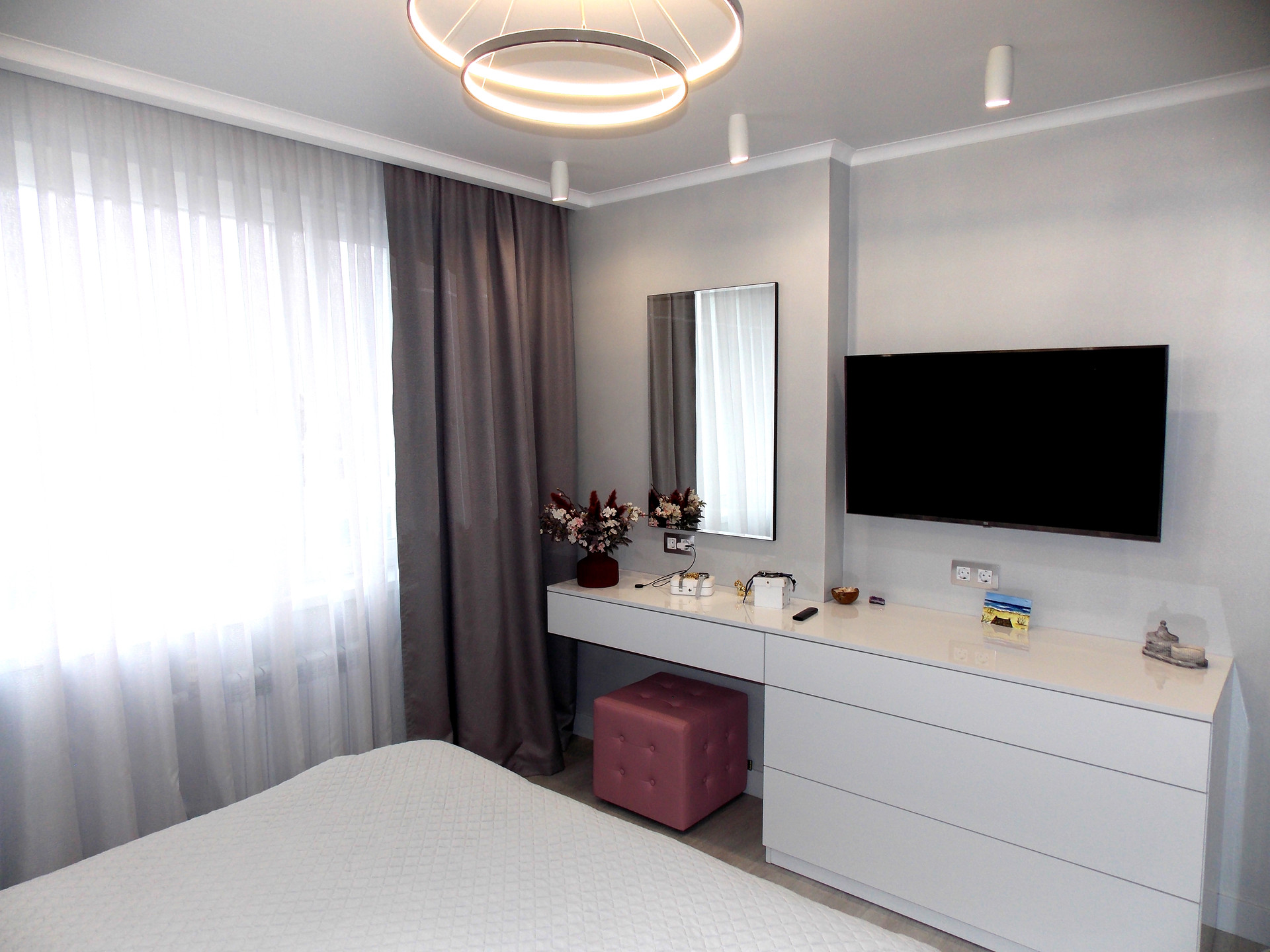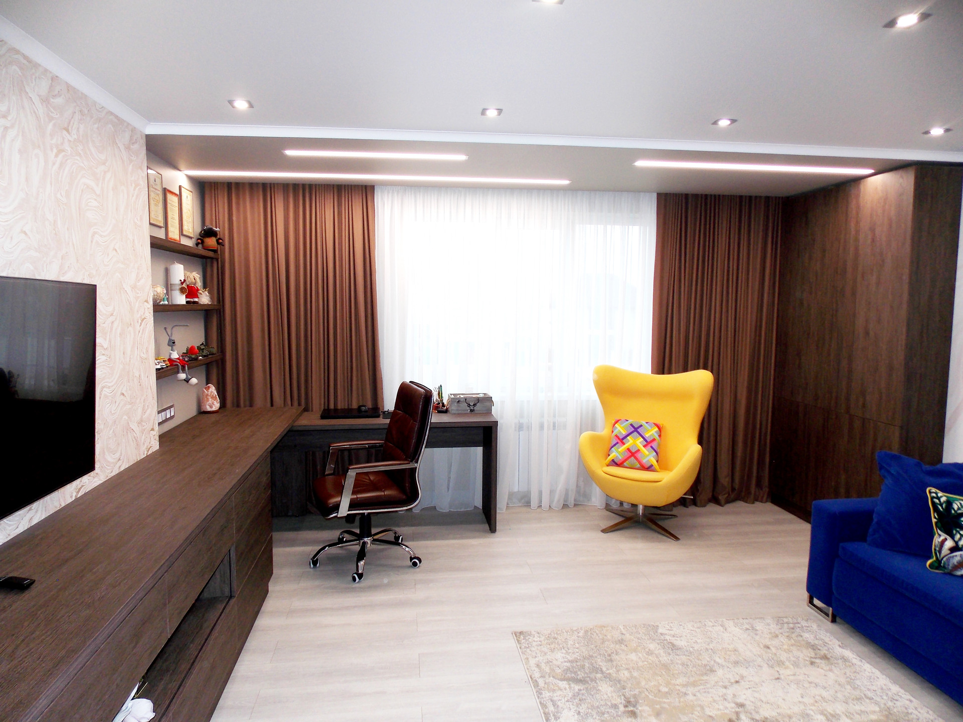 Светодиодные люстры в спальне и гостиной куплены на выставке в г.Москва. Дополнительное освещение в спальне в виде софитов. Дополнительное освещение в гостиной: софиты, бра.