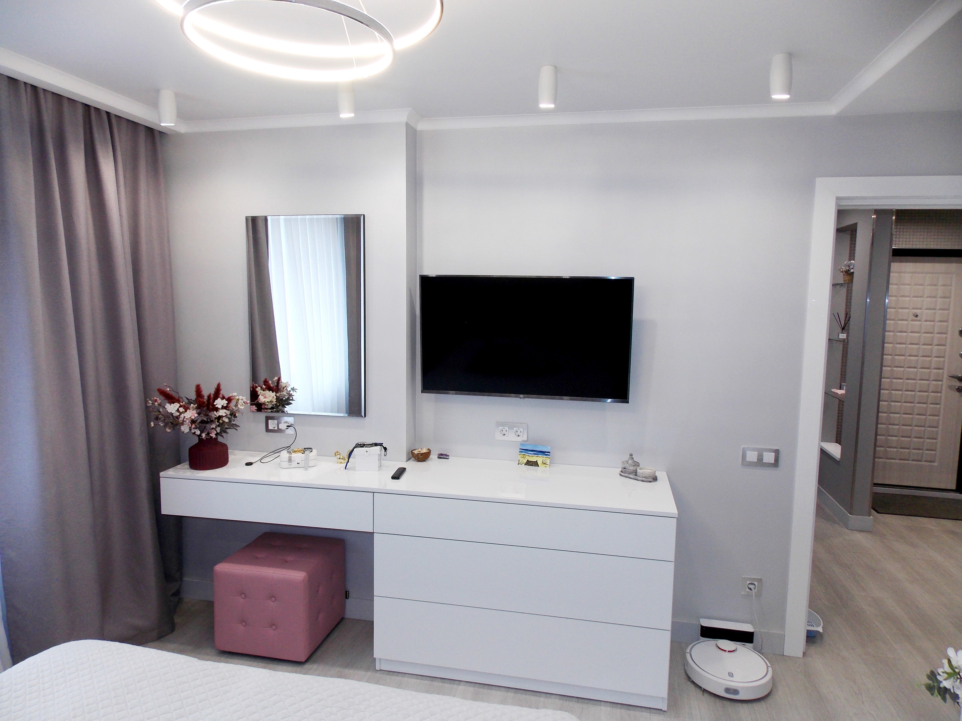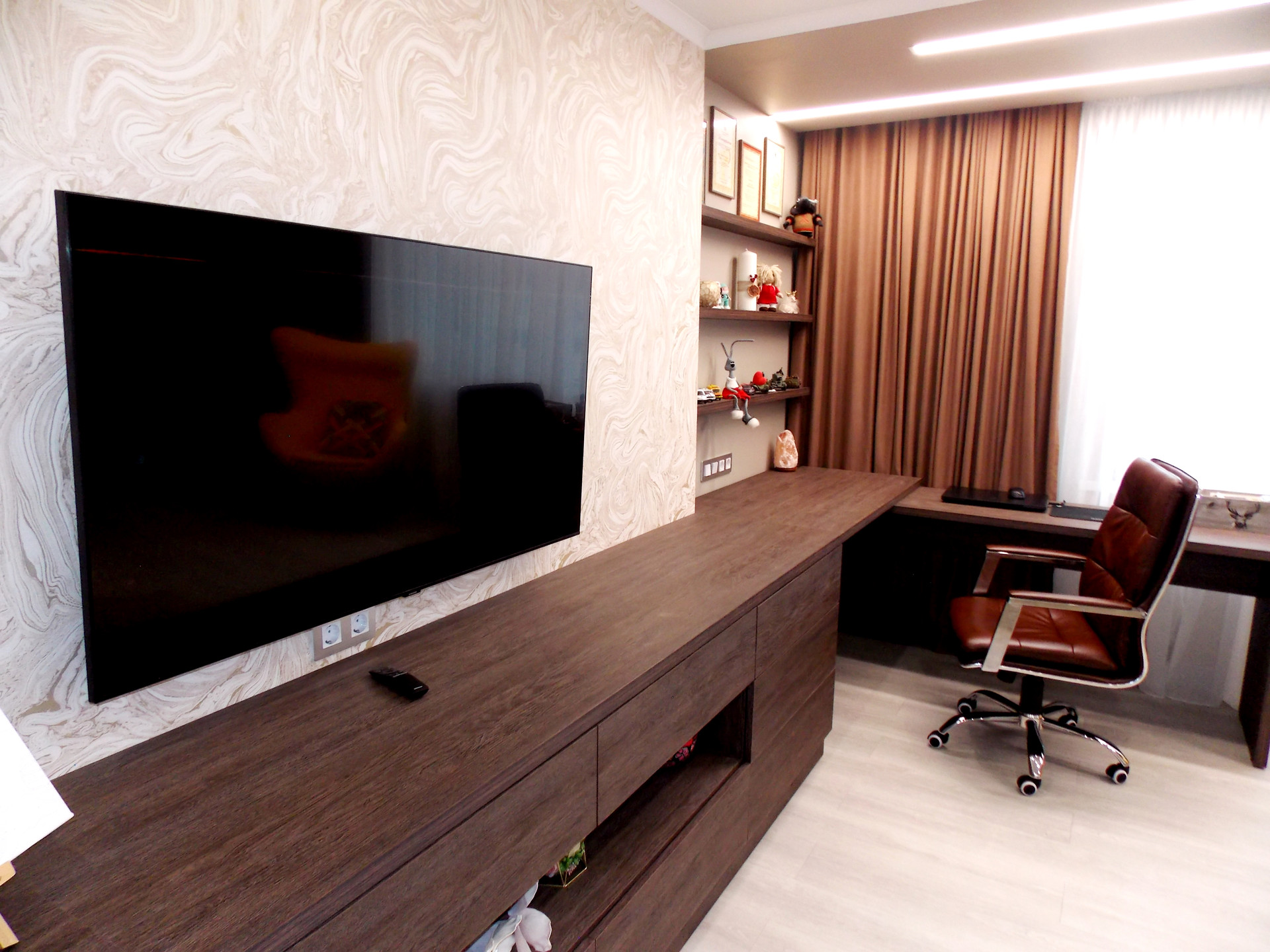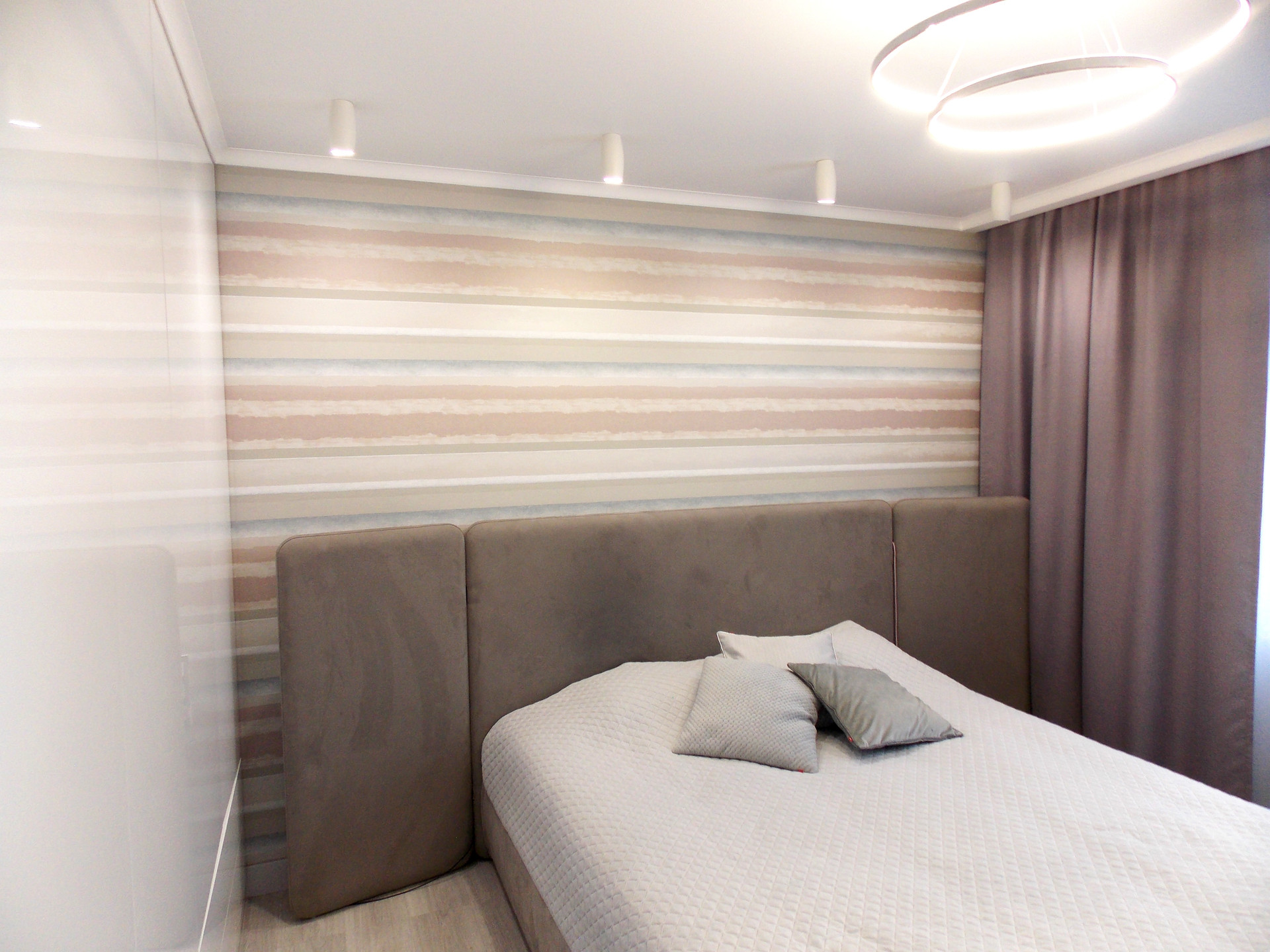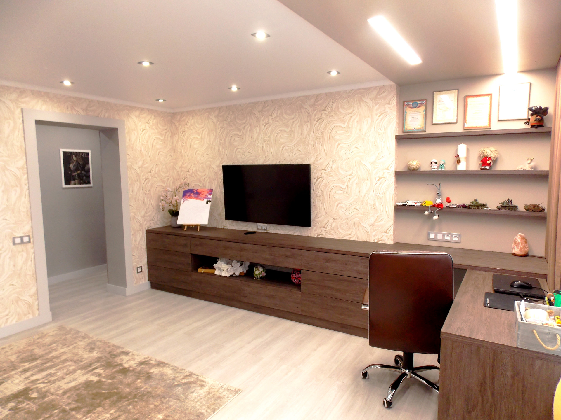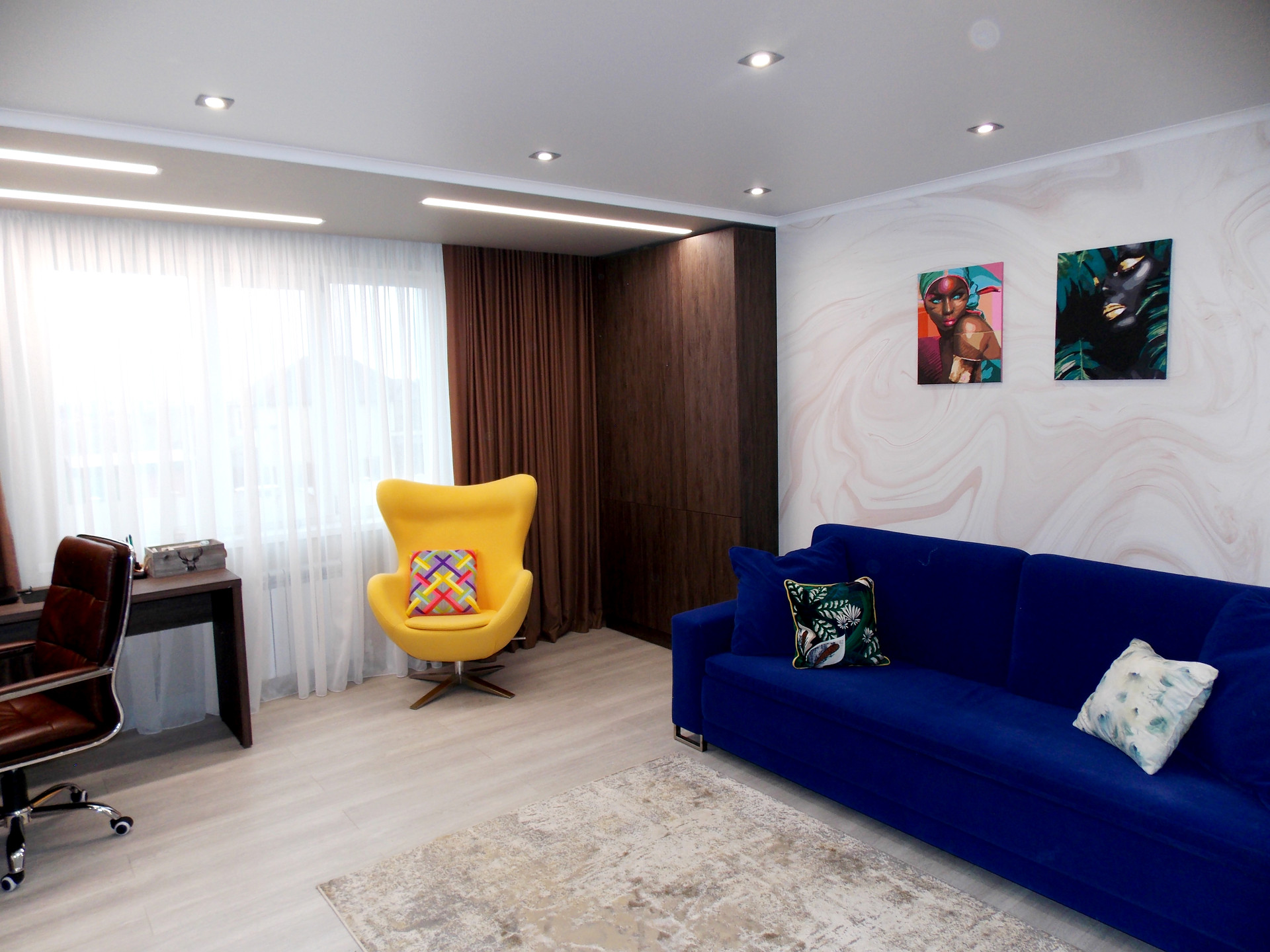 Светодиодные люстры в спальне и гостиной куплены на выставке в г.Москва. Дополнительное освещение в спальне в виде софитов. Дополнительное освещение в гостиной: софиты, бра.