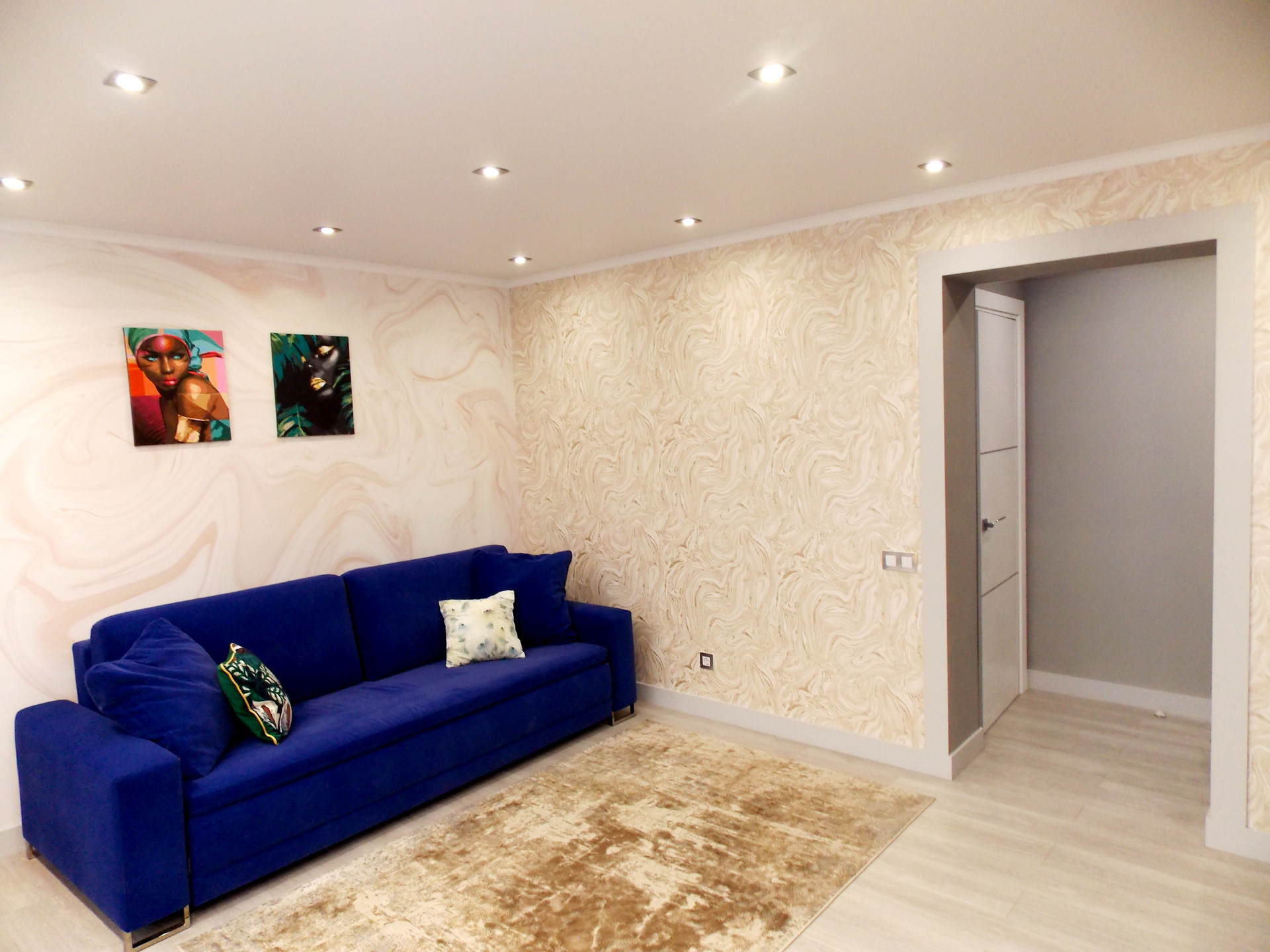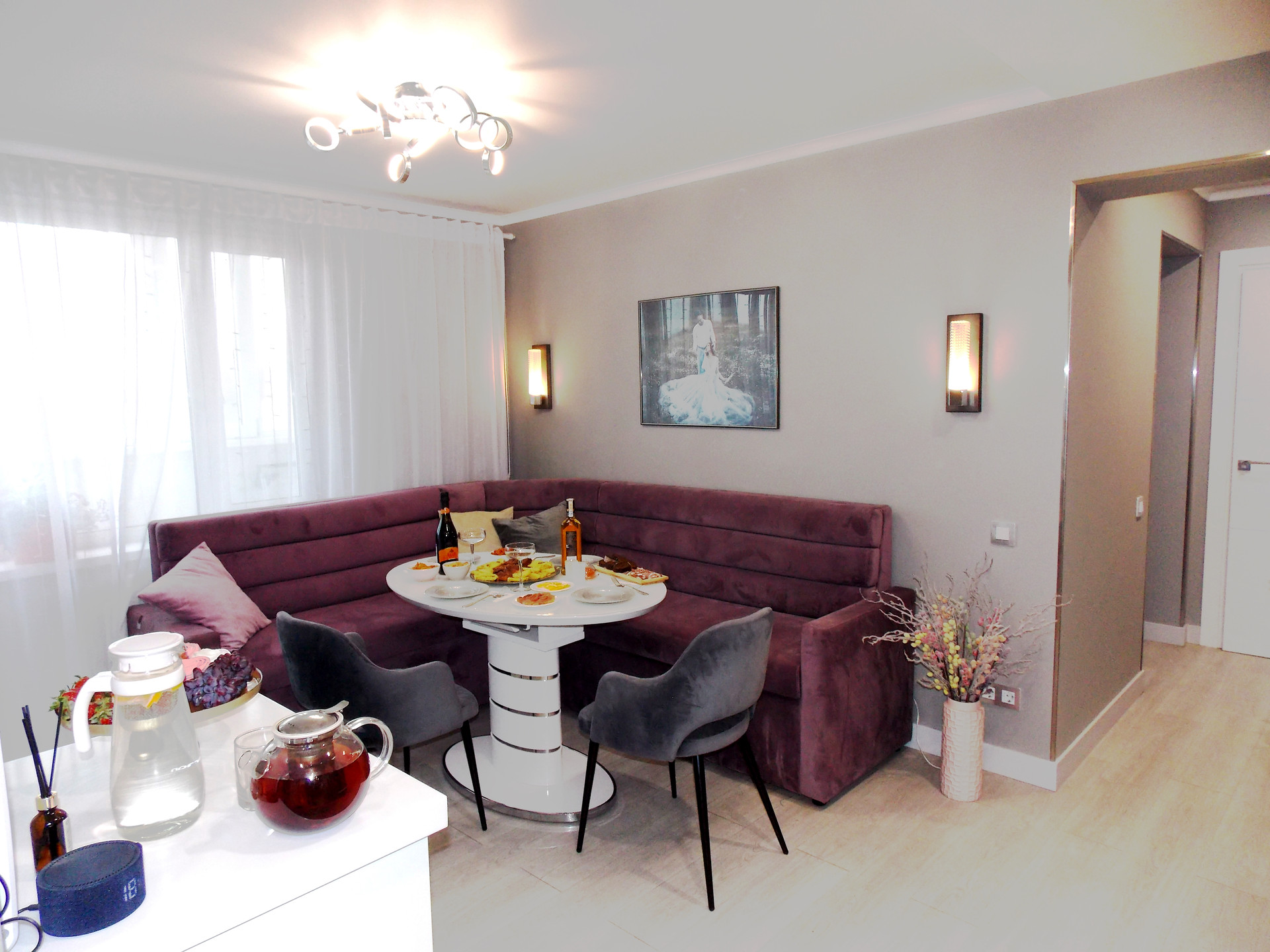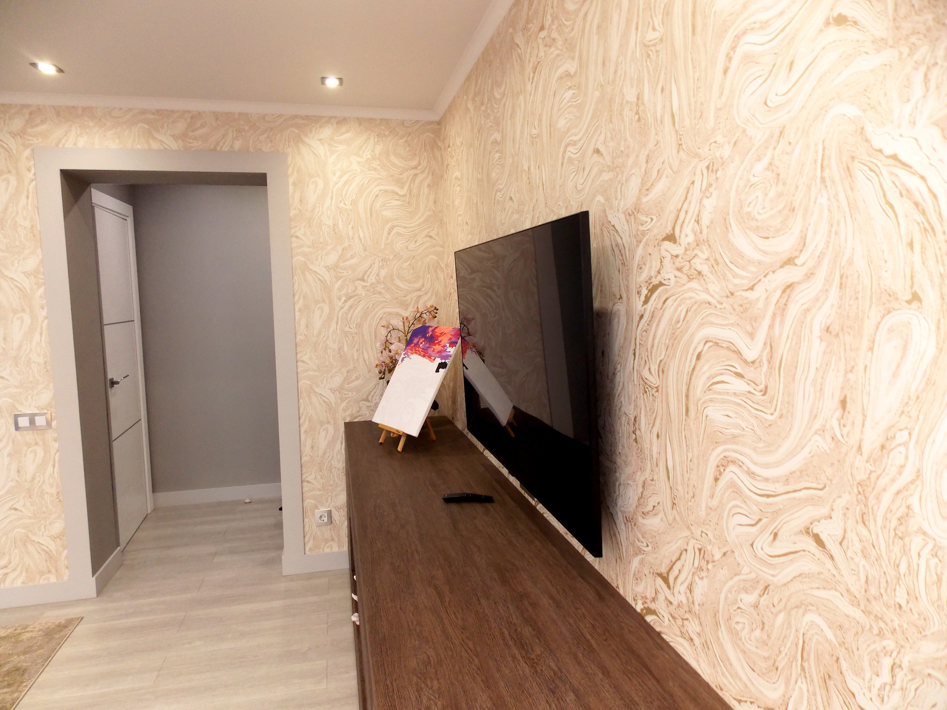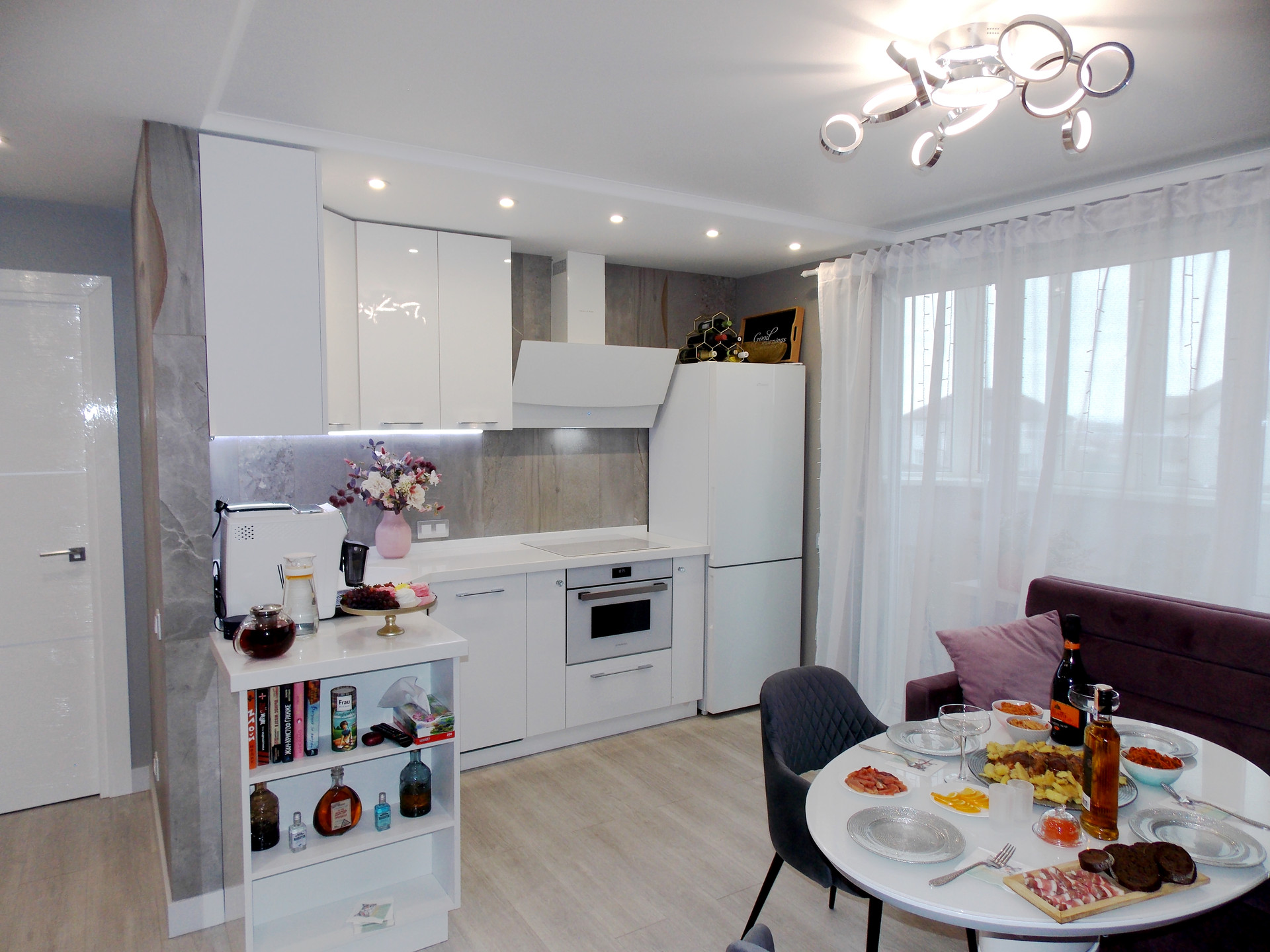 Светодиодные люстры в спальне и гостиной куплены на выставке в г.Москва. Дополнительное освещение в спальне в виде софитов. Дополнительное освещение в гостиной: софиты, бра.