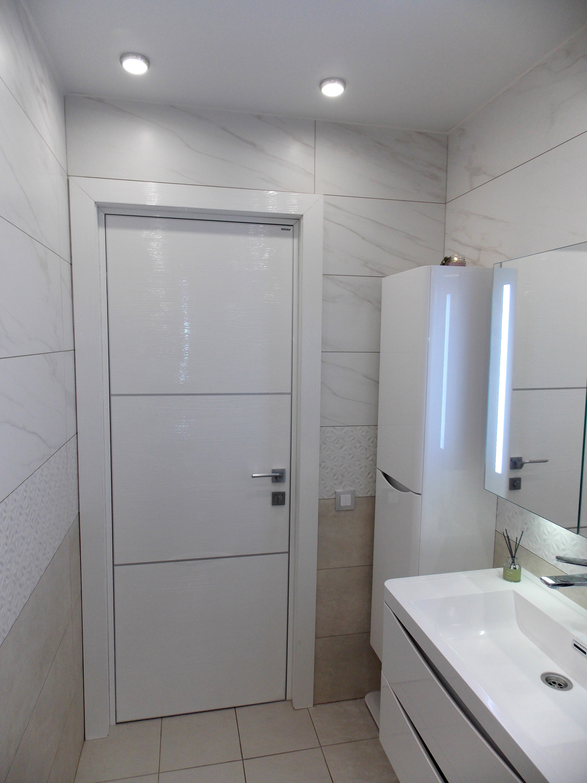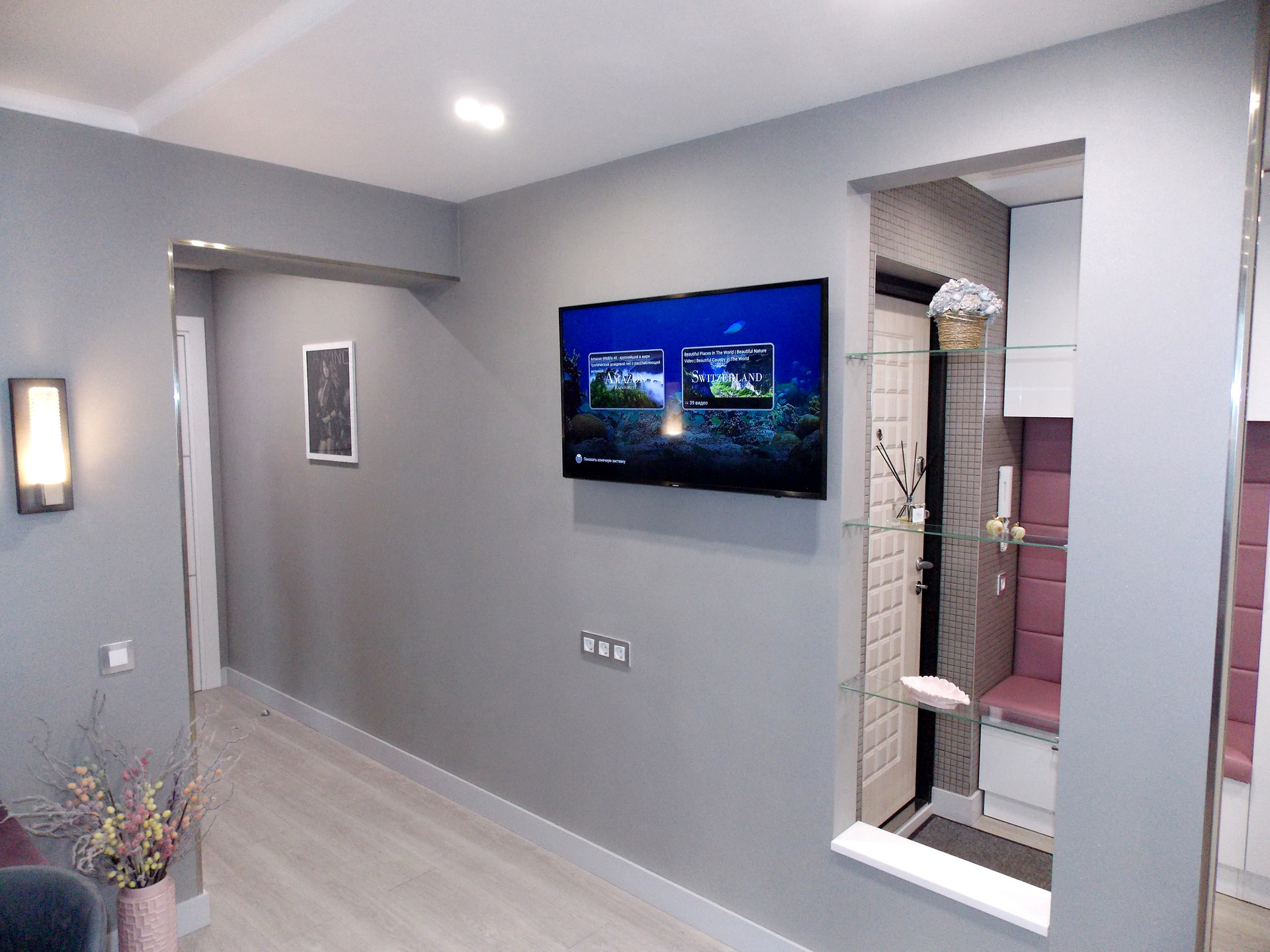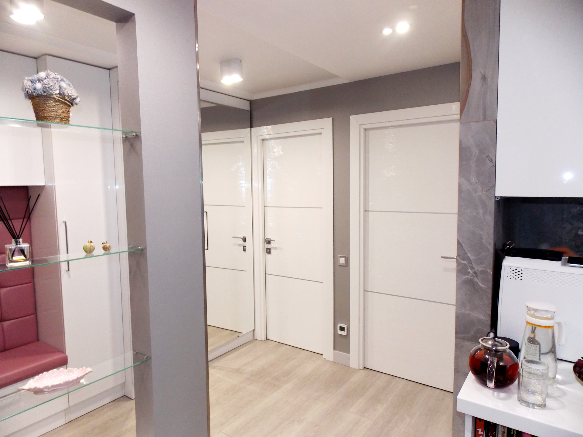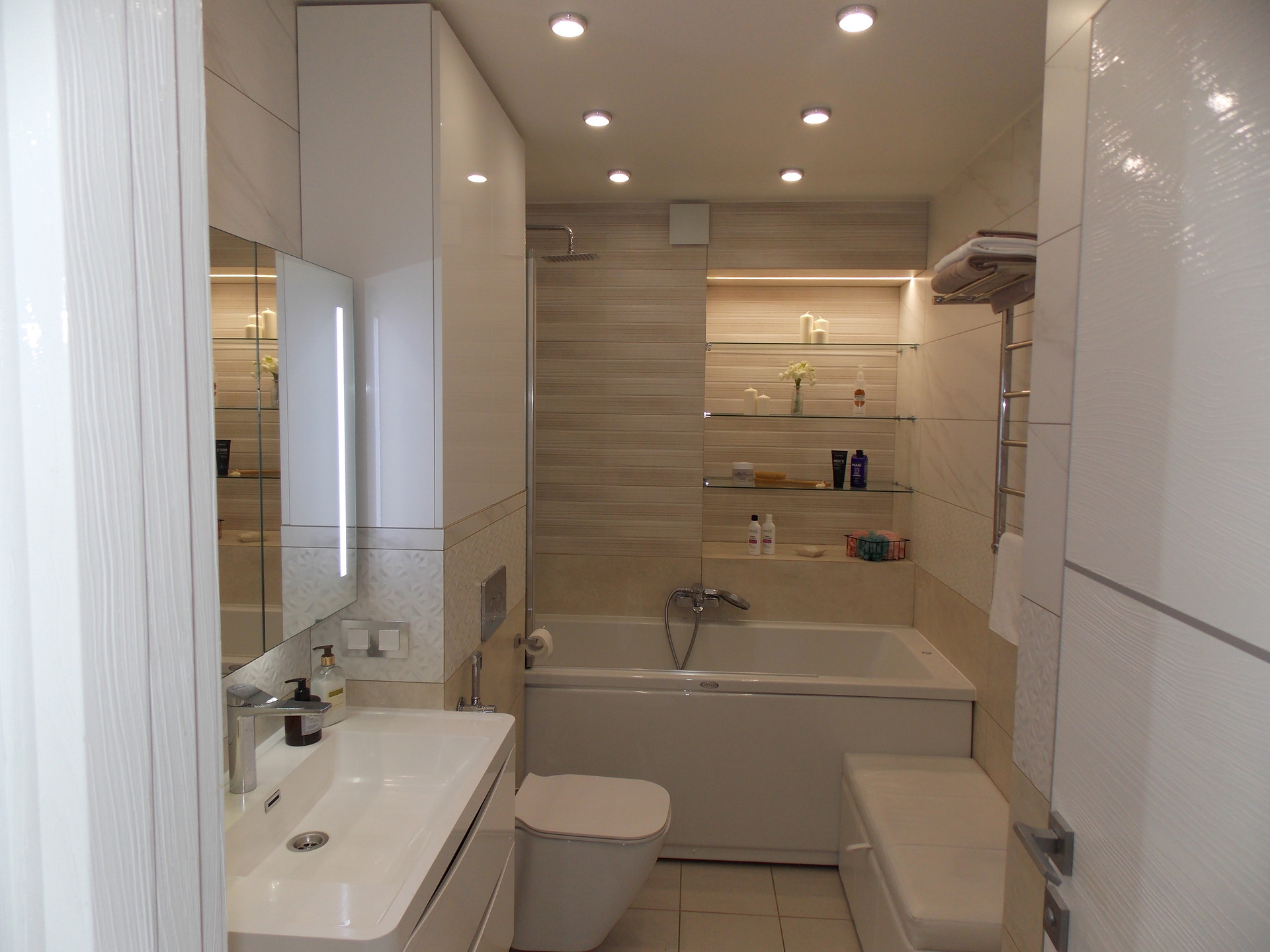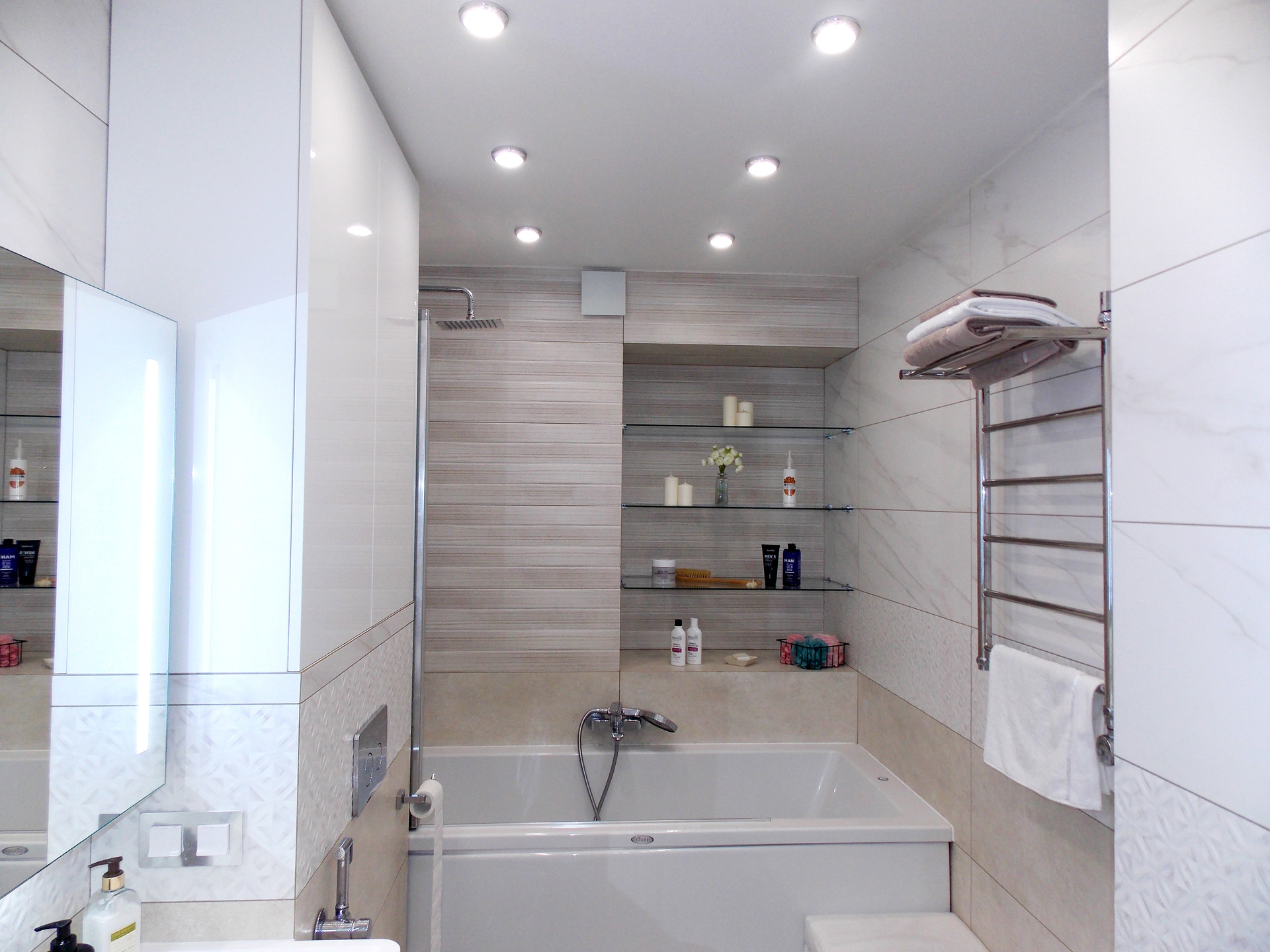 В коридоре, ванной, гардеробной, зале освещение в виде софитов.