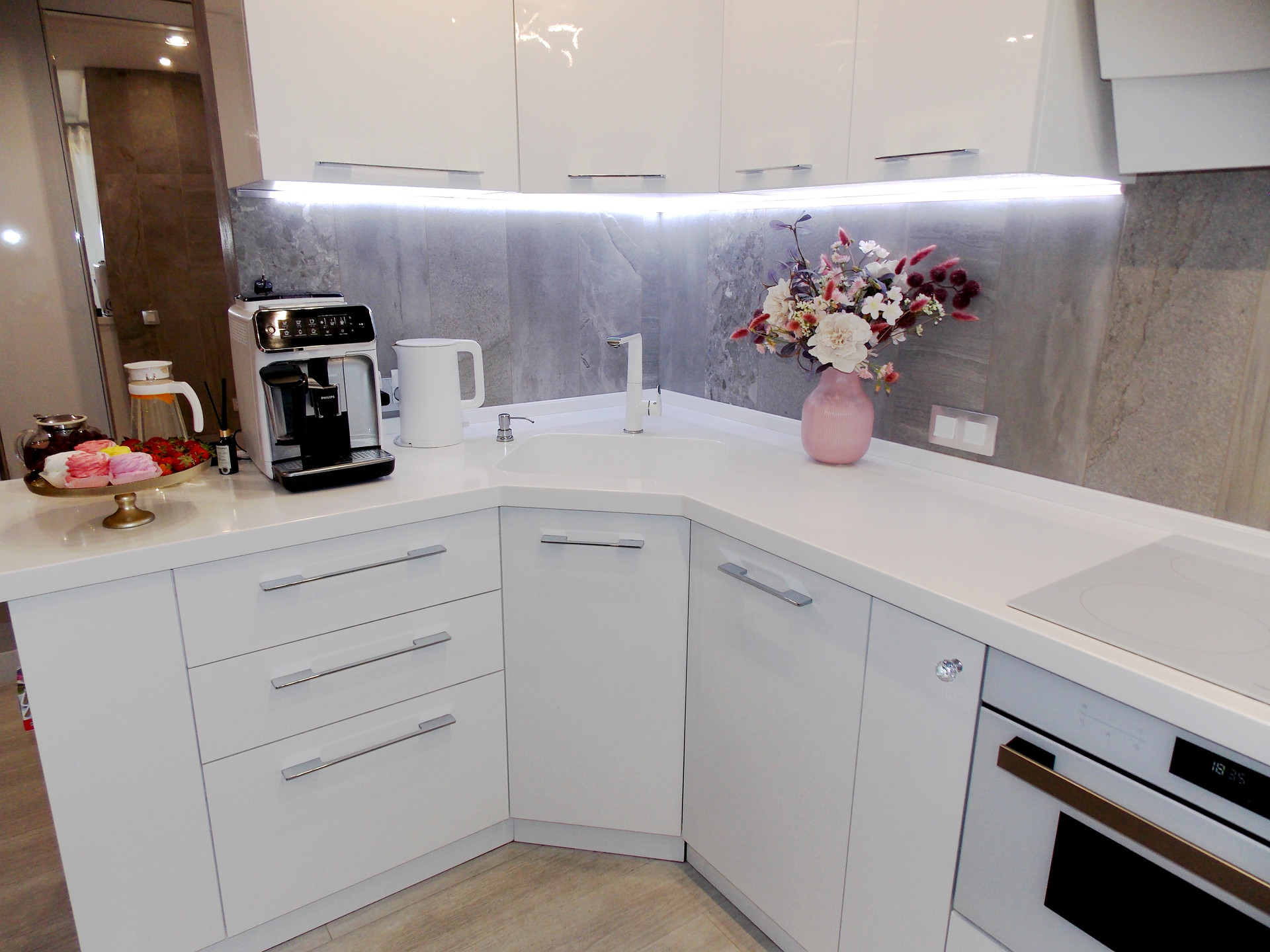 Фартук на кухне и стена в коридоре выполнена из керамической плитки (производство Италия).