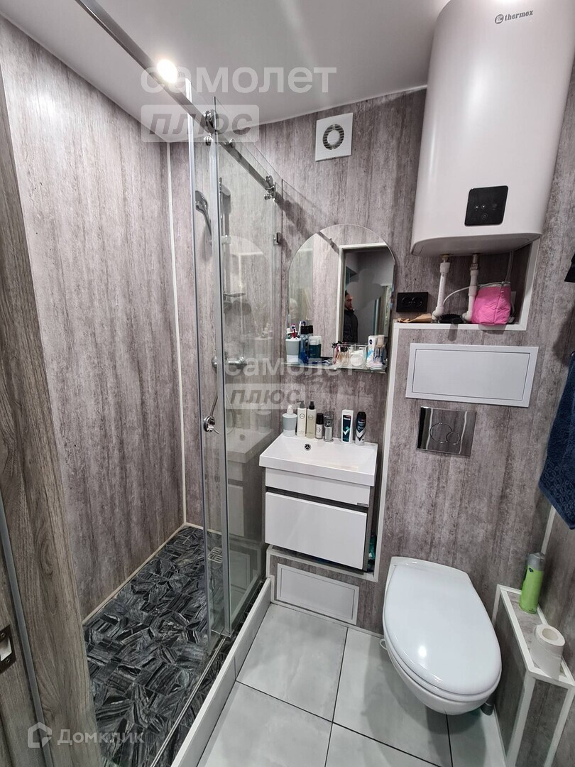 Совмещенный санузел обшит качественными пластиковыми панелями. Раздвижной стеклянной стеной разграничена зона для принятия душа.