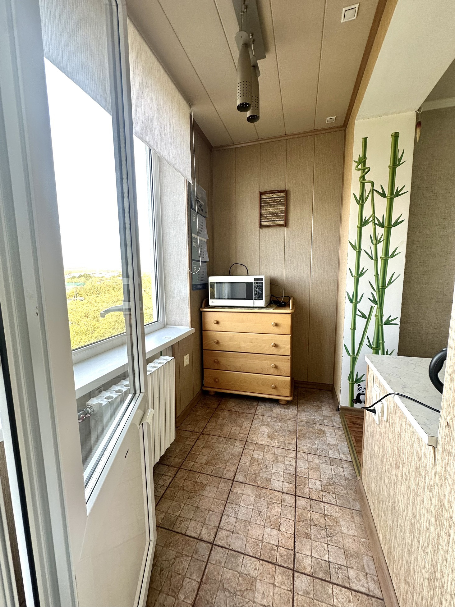 2 балкона, один из которых совмещен с кухней.