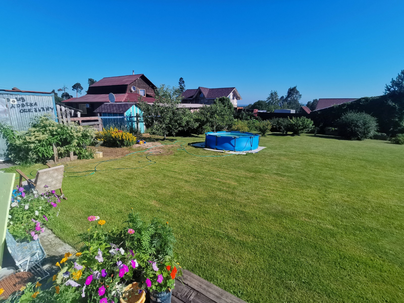 • Территория огорожена забором, ухожена - зеленый газон, есть теплица, беседка.