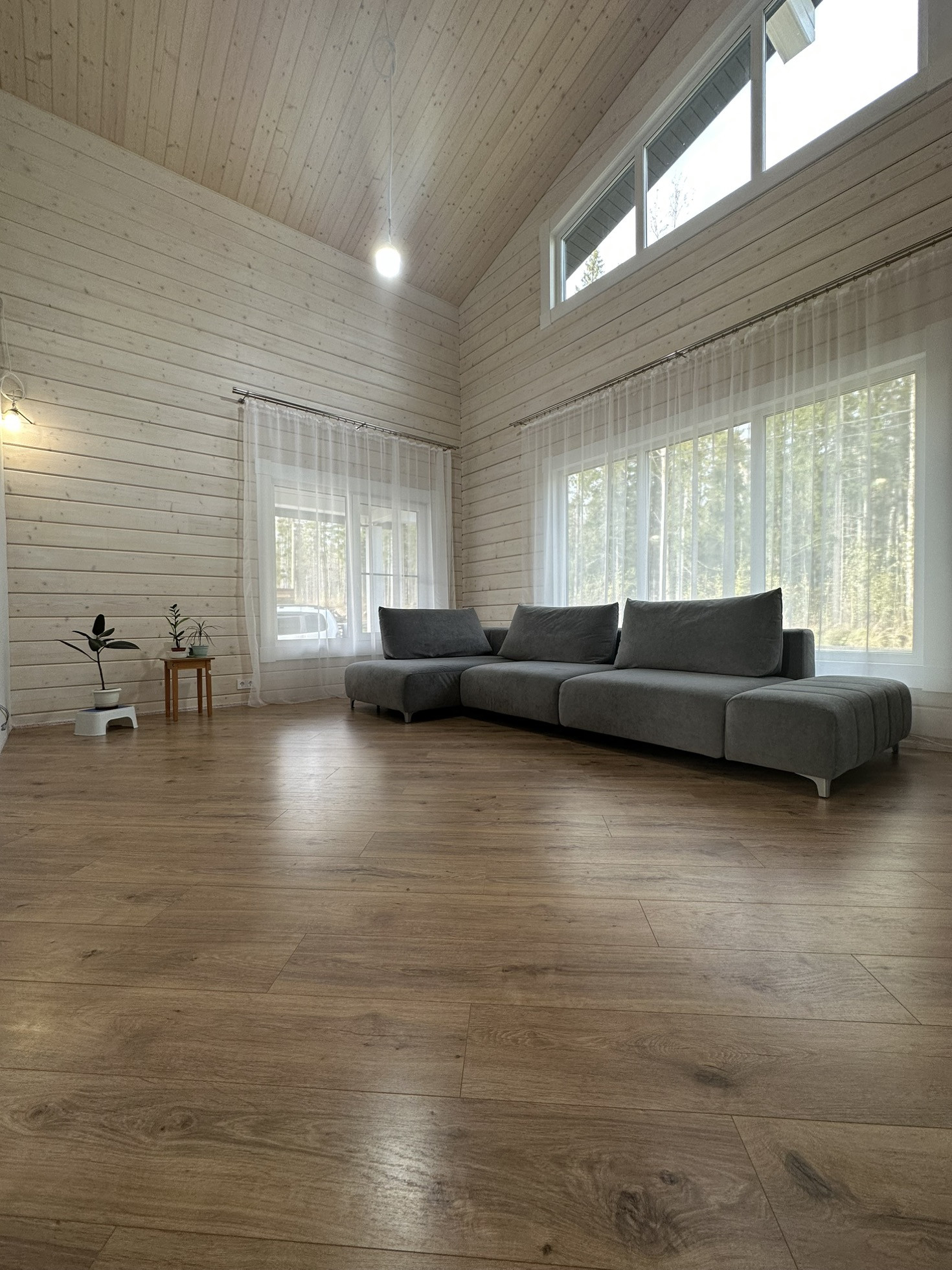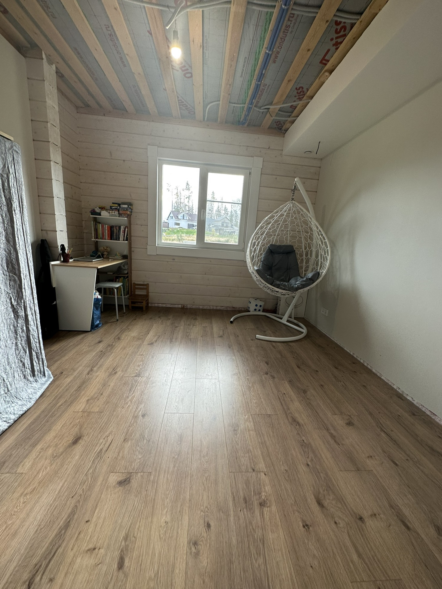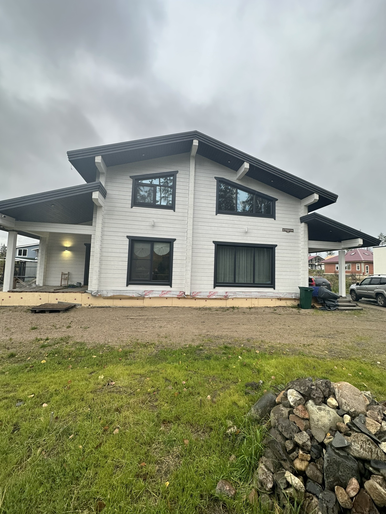 Дом из клеёного бруса на 200 мм, фасад окрашен двумя составами: антисеттирующим составом и защитными слоями краски. Перекрытия h=185мм и кровля h=300мм наполнены эковатой.