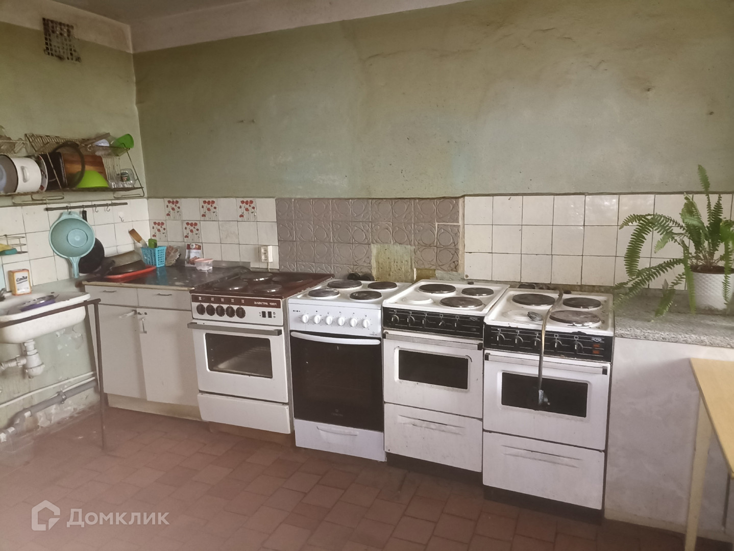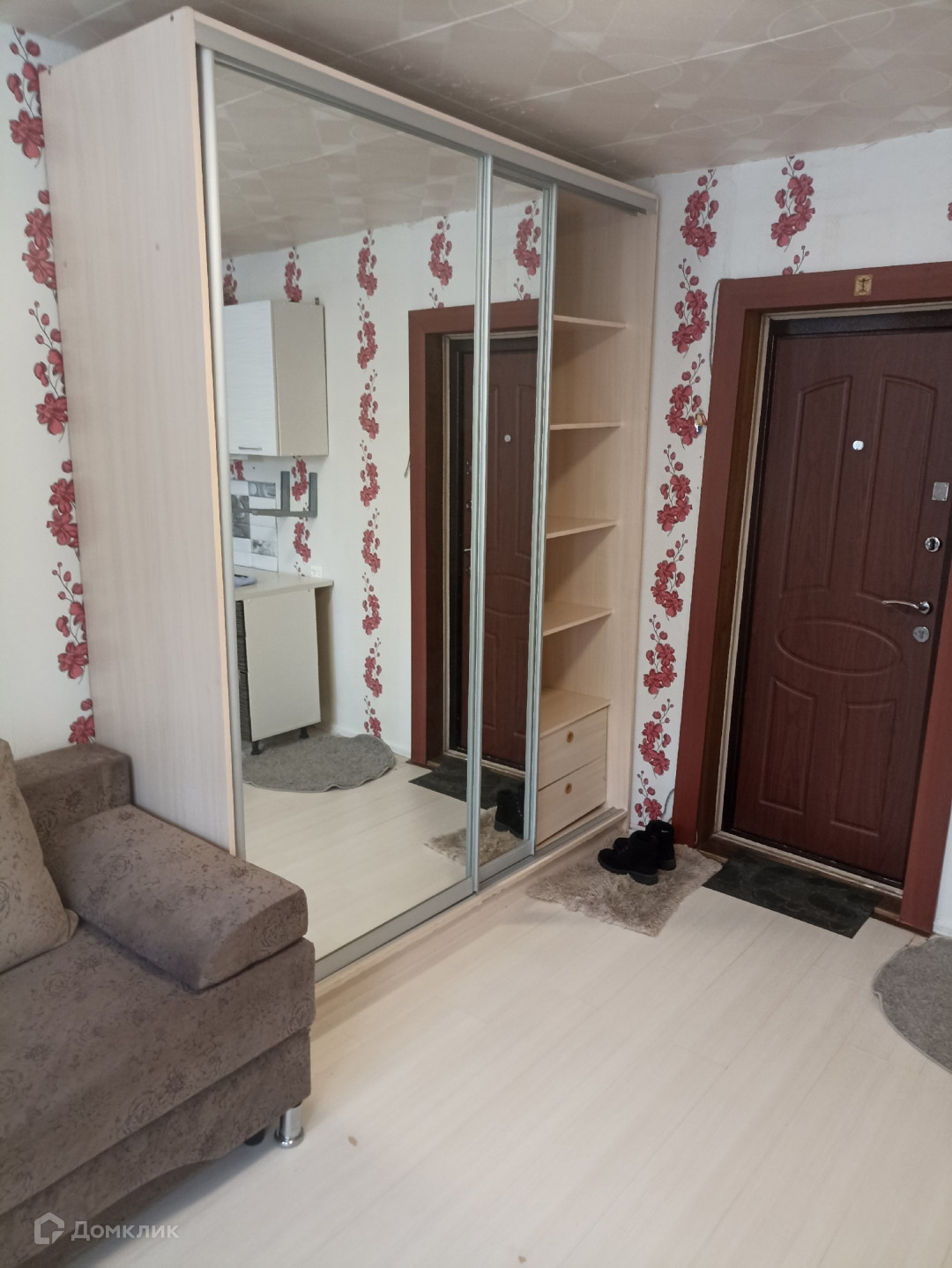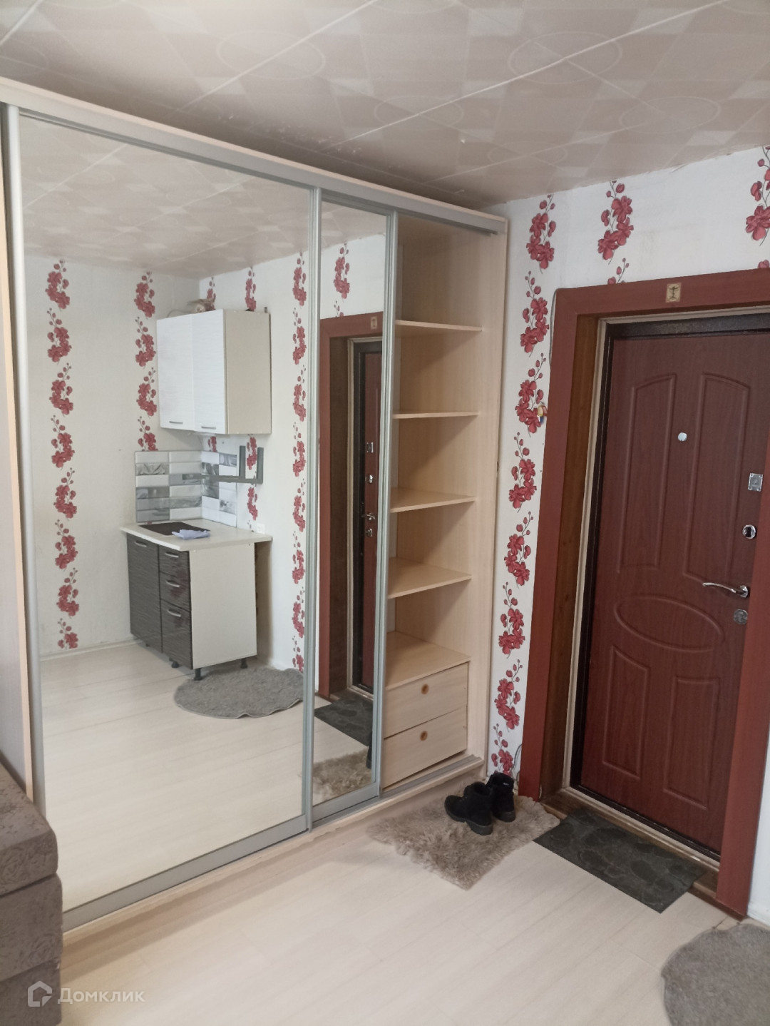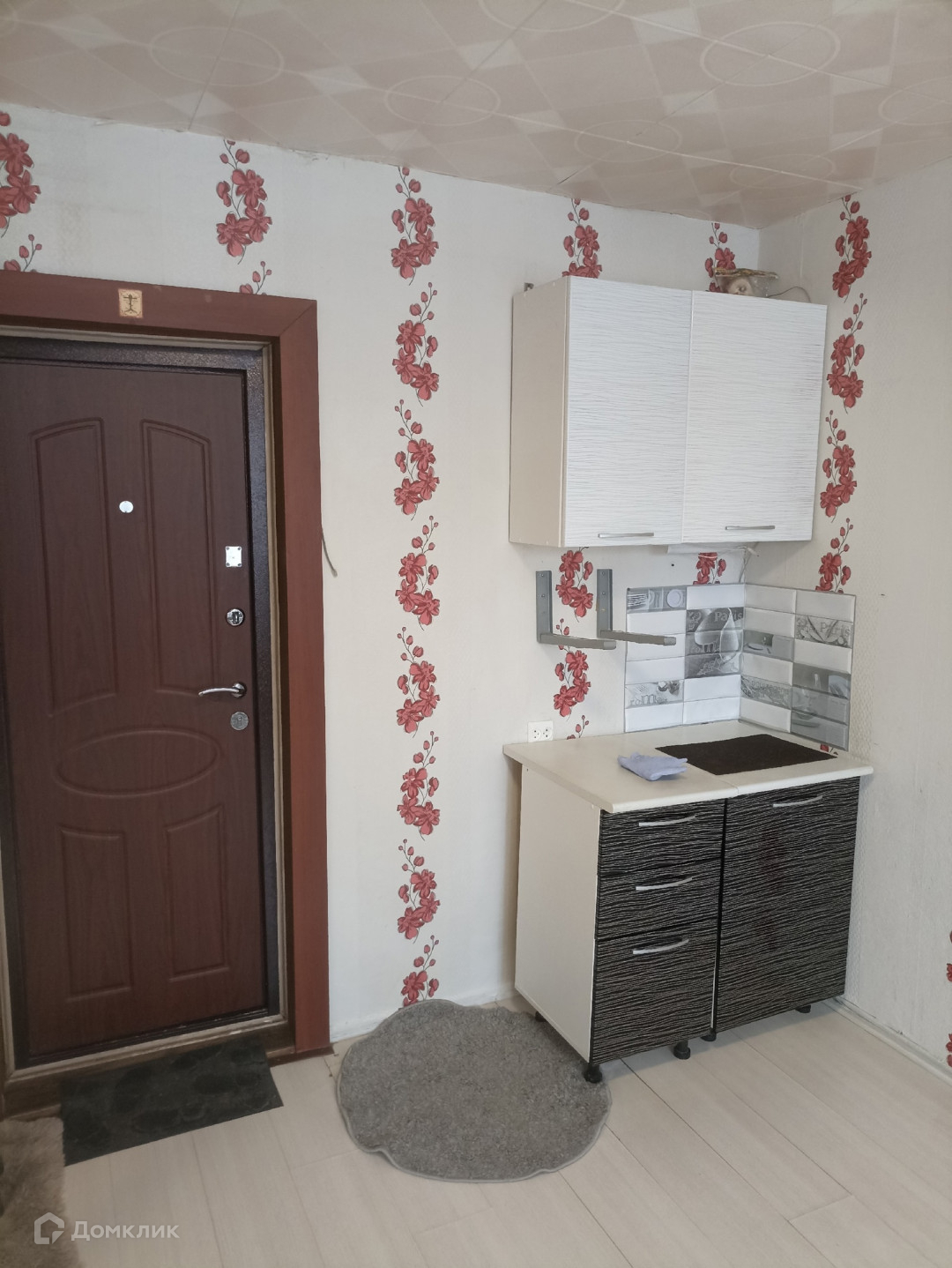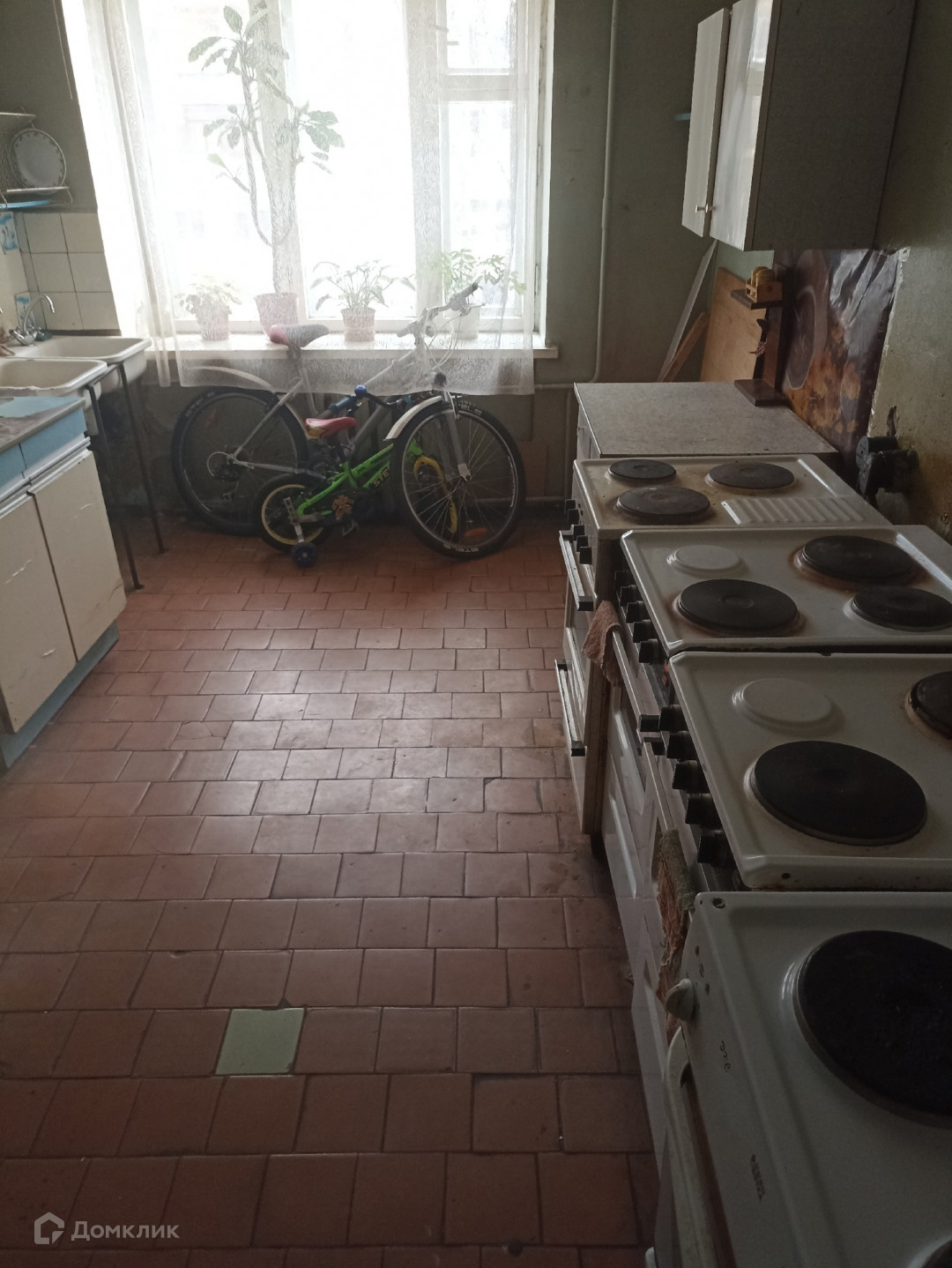 В коридоре у комнаты остается закрывающийся шкаф и тумба. Чистая, большая кухня, у каждого своя рабочая зона (два кухонных шкафчика)
