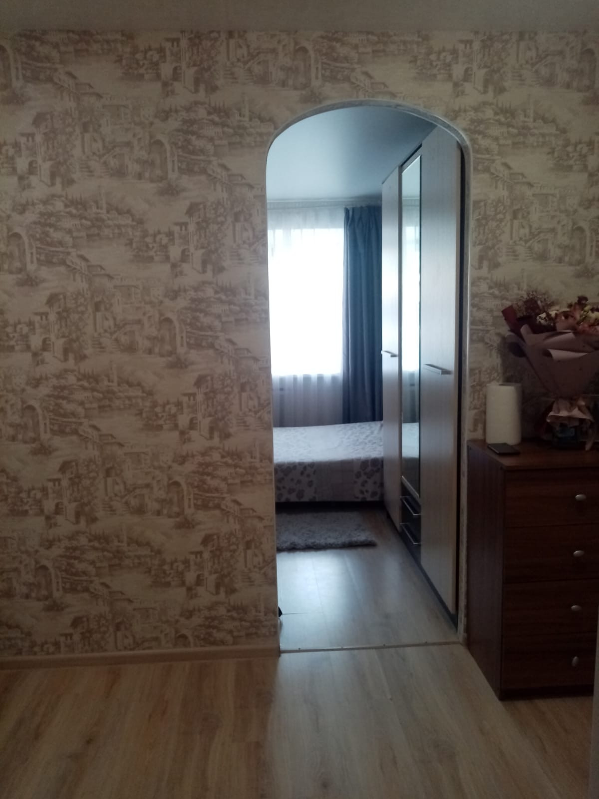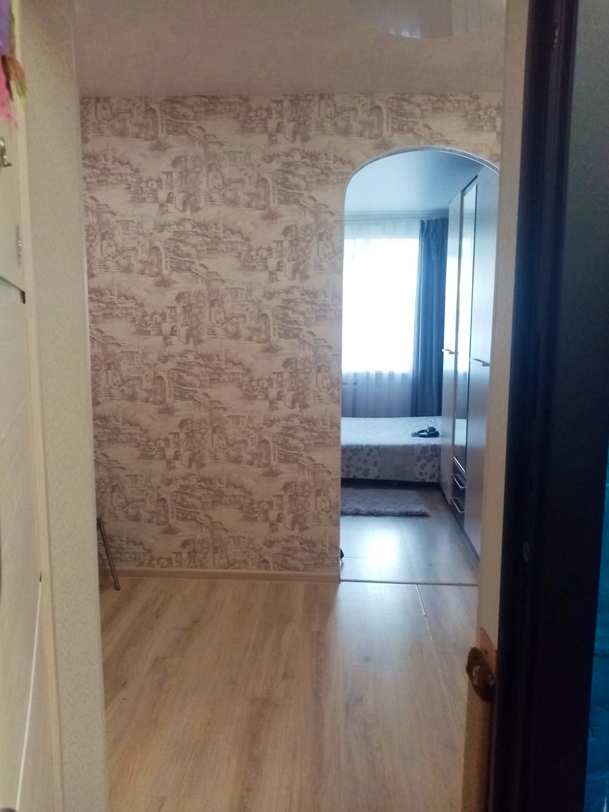 В комнате выполнен хороший ремонт: стеклопакеты, натяжные потолки и ламинат.