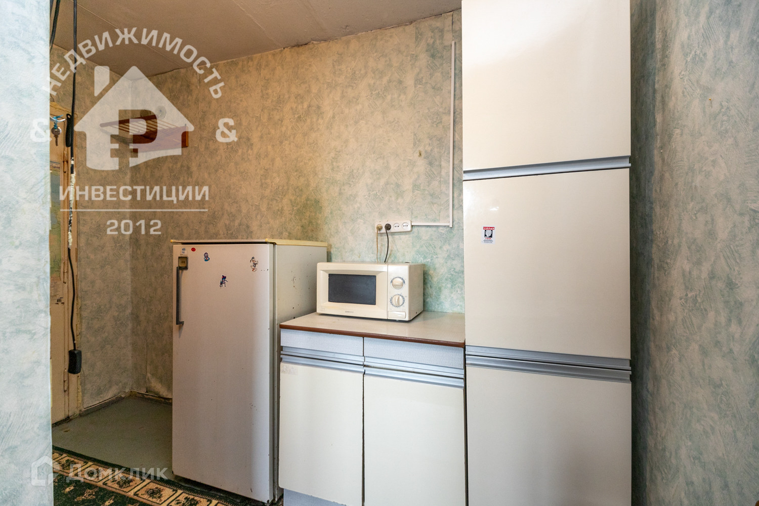 В комнате отделена  зона  кухни со шкафчиками,остаётся микроволновка,холодильник ;