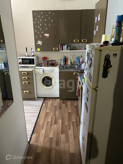 В комнате есть все необходимое: встроенная маленькая кухня, стиральная машина, холодильник и мебель. Окна выходят на солнечную сторону, хорошая шумоизоляция и приятные соседи.
