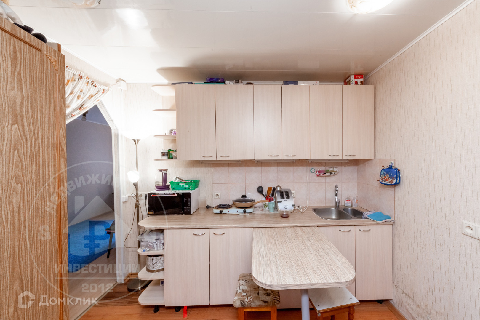 Остаётся кухонный гарнитур, диван, стеллаж.