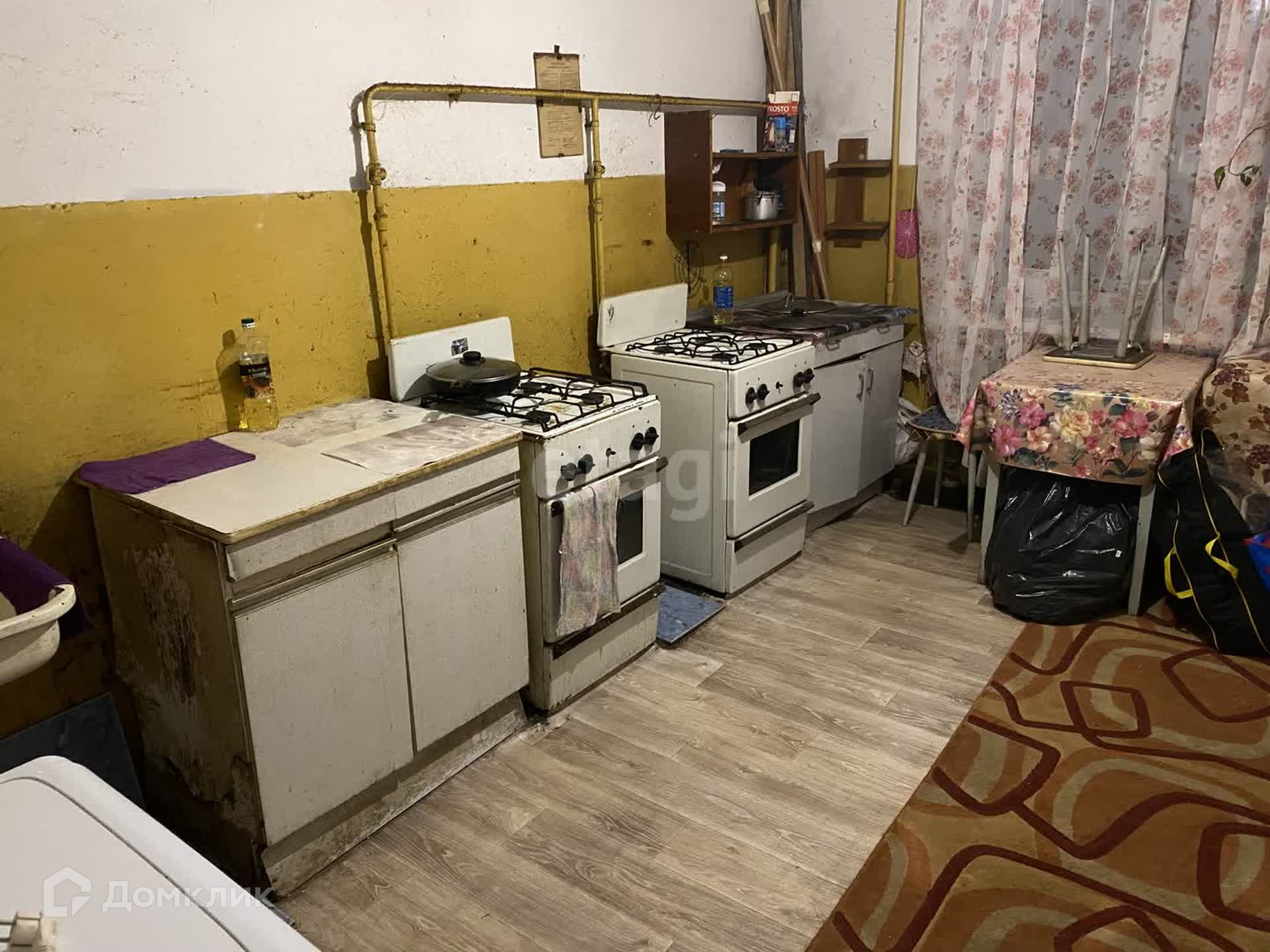 Также большая общая кухня, где расположены: две газовые плиты, посуда и стиральная машинка.