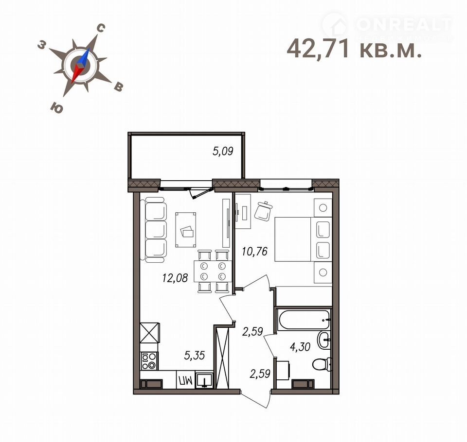 Общая площадь: 42,76