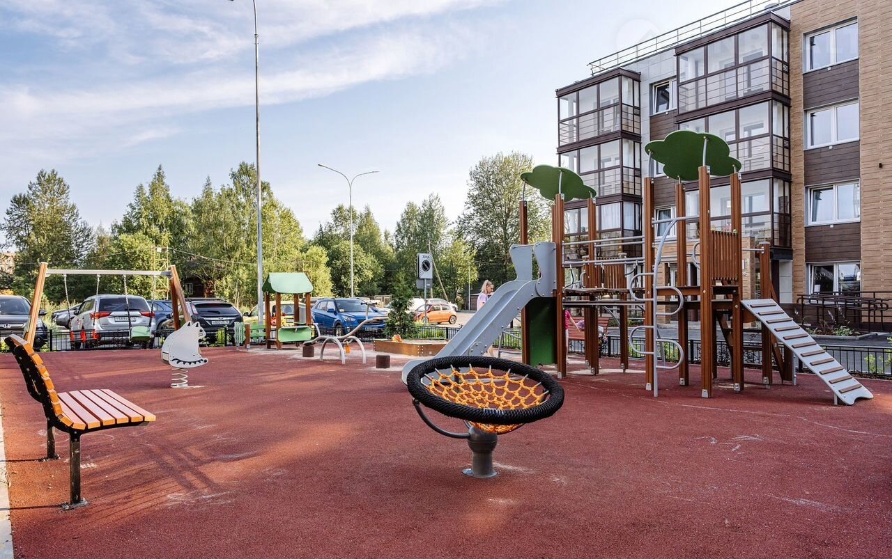 Благоустройство прилегающей территории включает детские и спортивные площадки, просторную парковку, удалённую от активных зон отдыха, а также озеленение.