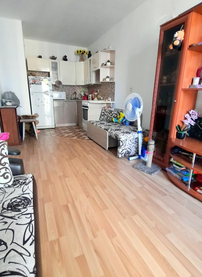 Жилая зона и зона кухни объединены в одно помещение площадью около 19 кв.м. Кухонный уголок небольшой, но вполне достаточный для одного-двух человек. Установлена стеклокерамическая электроплита. Санузел совмещенный, полностью отделан кафельной плиткой. В прихожей установлен большой шкаф-купе.