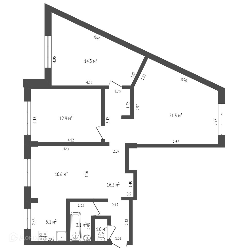 Площади комнат- 21,5 кв.м, 14,3 кв.м, 12,9 кв.м, 10,6 кв.м.
