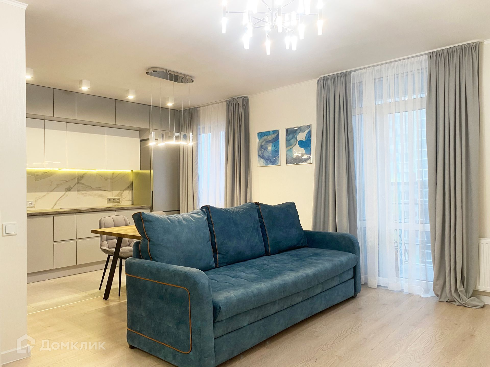 Квартира меблирована: остается встроенная кухня с доводчиками Blum, варочная поверхность Bosch, вытяжка.