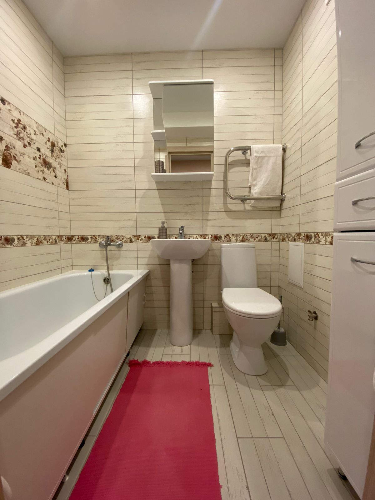Санузел совмещённый, отделка кафелем, установлена сантехника, счётчики на воду.