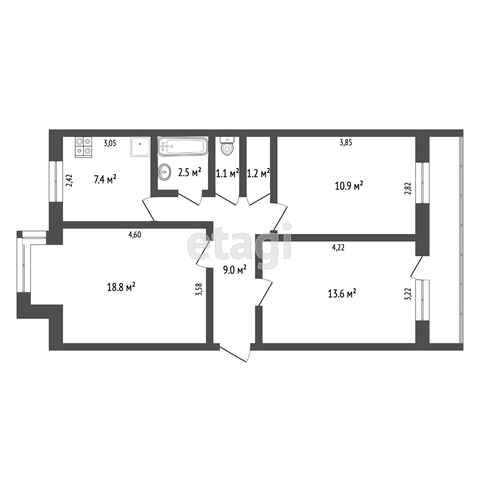 Расположена на 5 этаже, общая площадь- 70,6 кв.м.