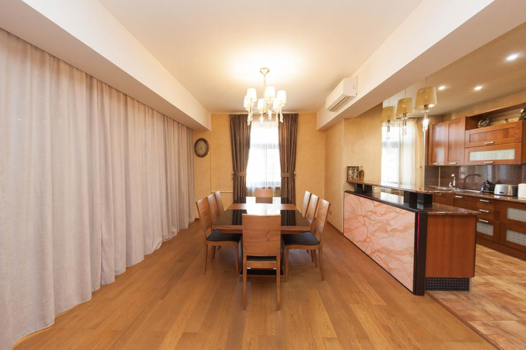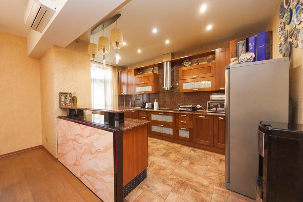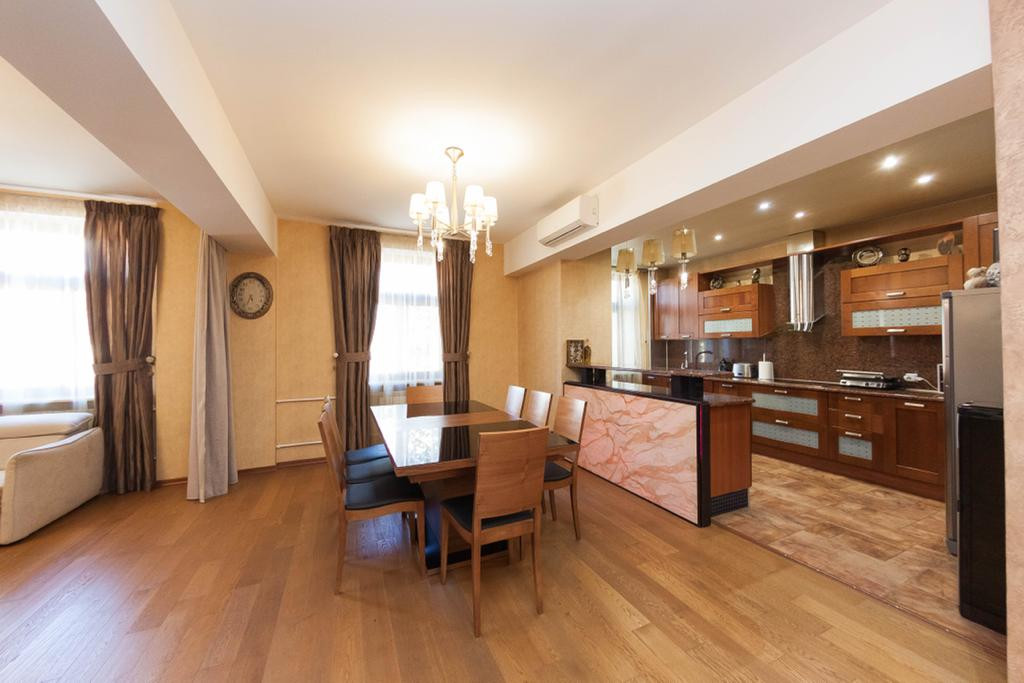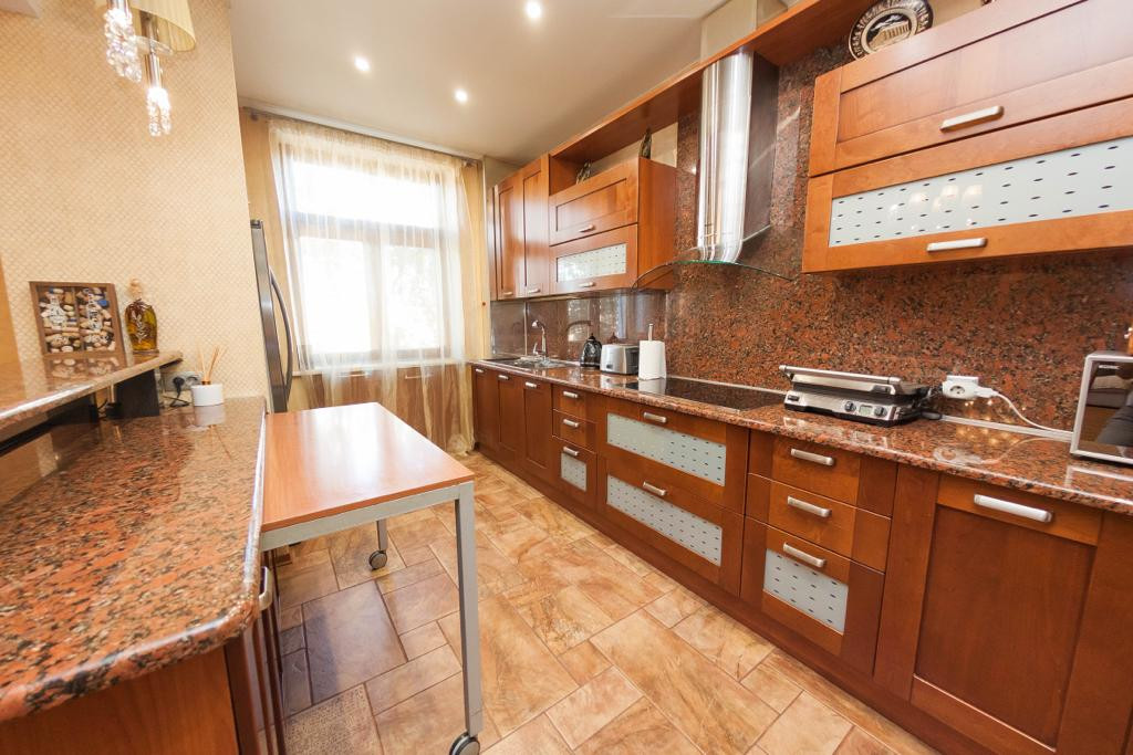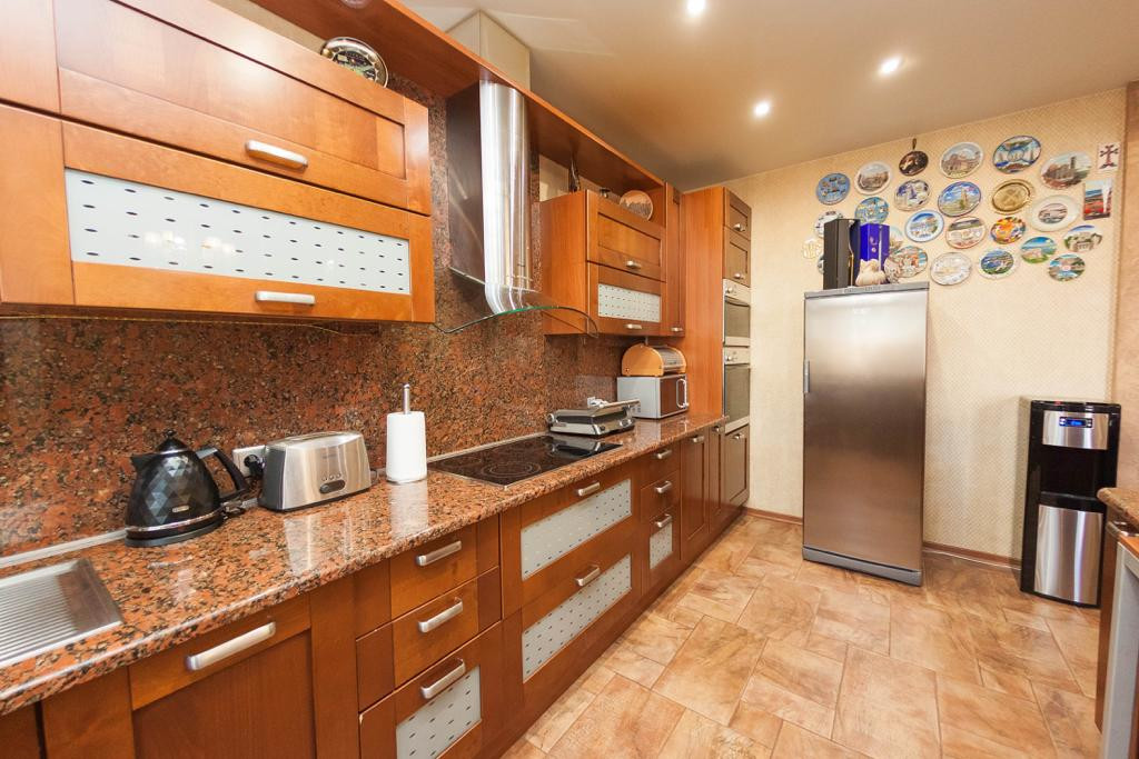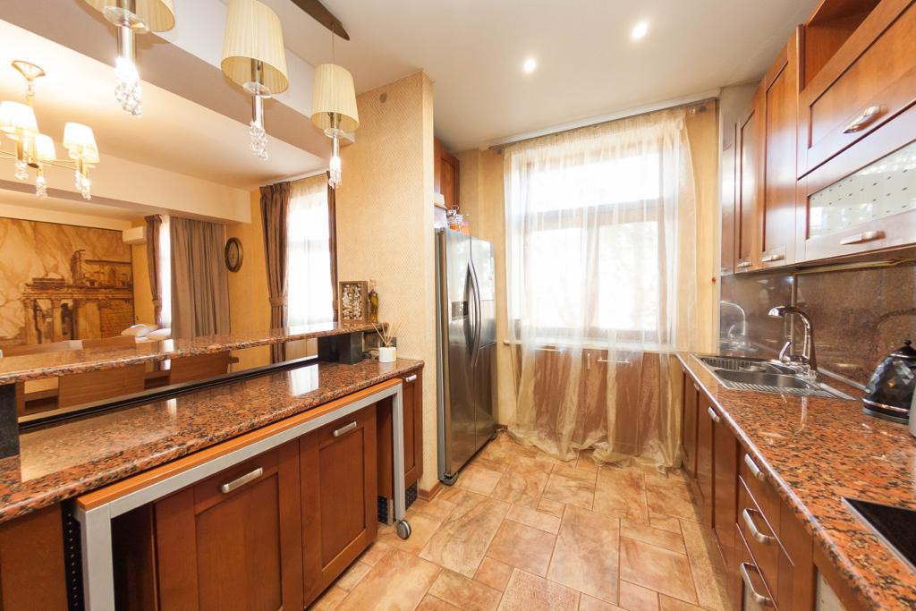 Кухня: качественная встроенная кухня (массив), столешница из натурального камня, принудительная вытяжка с подсветкой зоны освещения приготовления пищи MIELE, холодильник двухстворчатый LG, встроенная варочная поверхность MIELE, встроенный духовой шкаф MIELE, паровая духовка MIELE, встроенная посудомоечная машина BOSCH, качественный европейский кухонный смеситель, в центре зоны кухни расположен кухонный остров с тремя сторонами доступа и выдвижной столешницей, а так же с зоной освещения и декоративной картиной с гибкого камня с подсветкой, кухонный стол и восемь стульев, напольное покрытие плитка, теплые полы (кухня, прихожая и ванная комната электрические), натяжной потолок с точечным освещением, качественные обои.