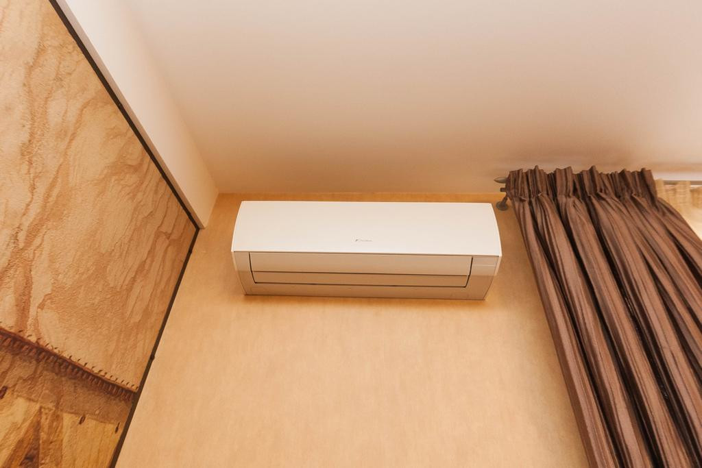 Гостиная комната: декоративная картина во всю стену с гибкого камня с разной подсветкой, две подвесные колонны и тумба под телевизор, два кондиционера, подвесной потолок, за счёт плотных Японских штор есть возможность зонирования пространства гостевой комнаты от зоны кухни.