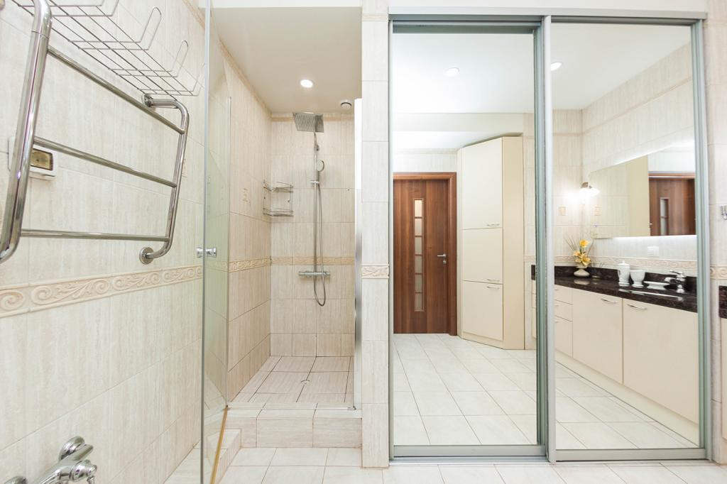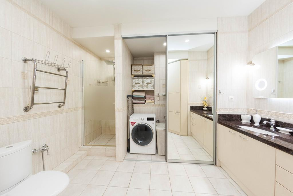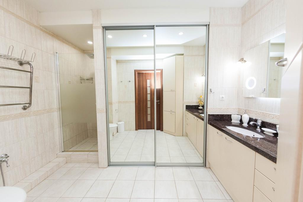 Ванна с санузлом совмещены, напольное покрытие и стены качественная плитка , теплые полы, душевая кабина с стеклянной дверцей, при санузле установлено беде, раковина со столешницей из натурального камня, подвесное зеркало с подсветкой, стиральная машинка LG, потолок - точечное освещение, два водонагревателя 200 литр. и 120 литр..