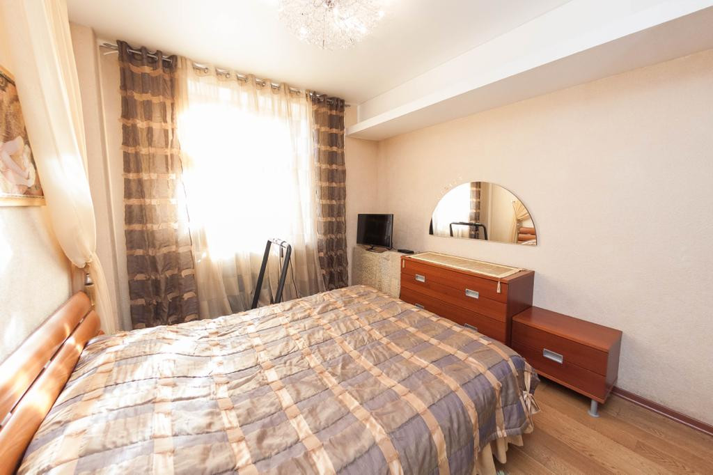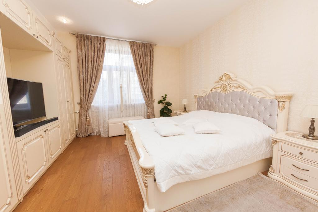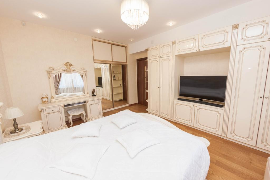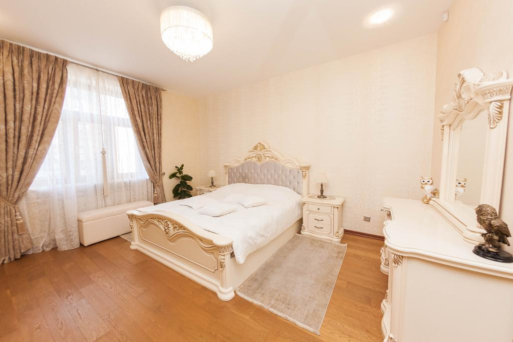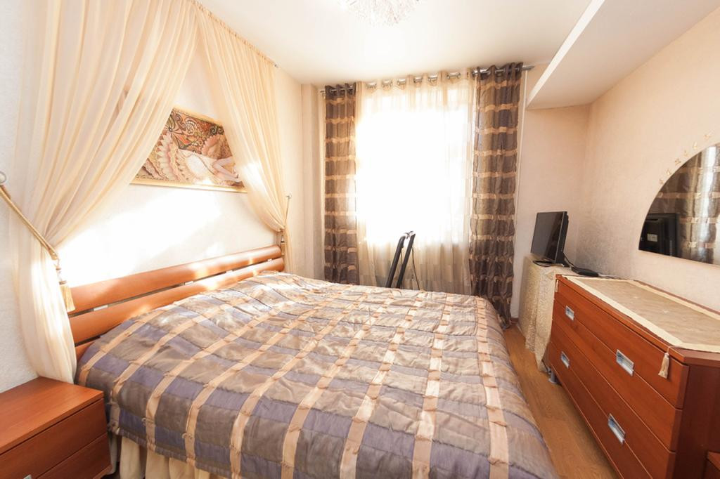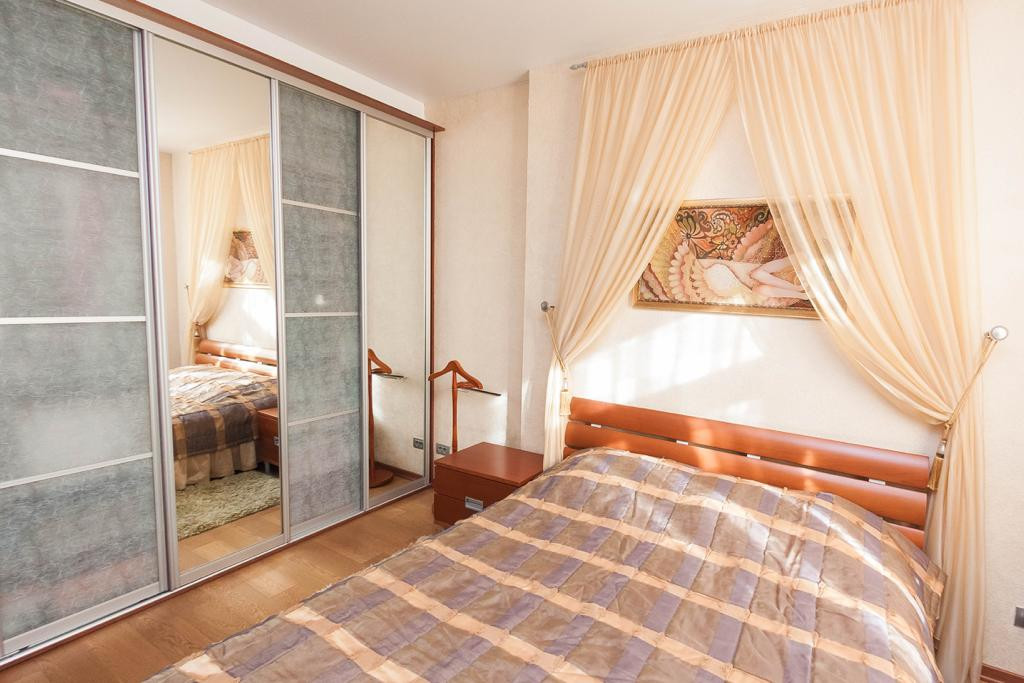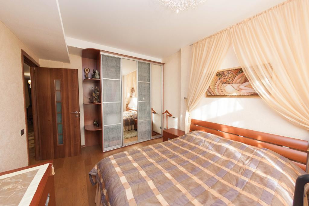 Две спальные комнаты: мебель в спальной комнате вся из массива, 4 - х створчатый и 2 - х створчатый вместительные шкафы с зеркальными дверцами, двуспальные кровати, две тумбочки прикроватные, комод, туалетный столик, напольное покрытие качественный ламинат под дерево (спальные и гостиная), потолок выровнен и оклеен моющими рельефными обоями, точечное освещение.