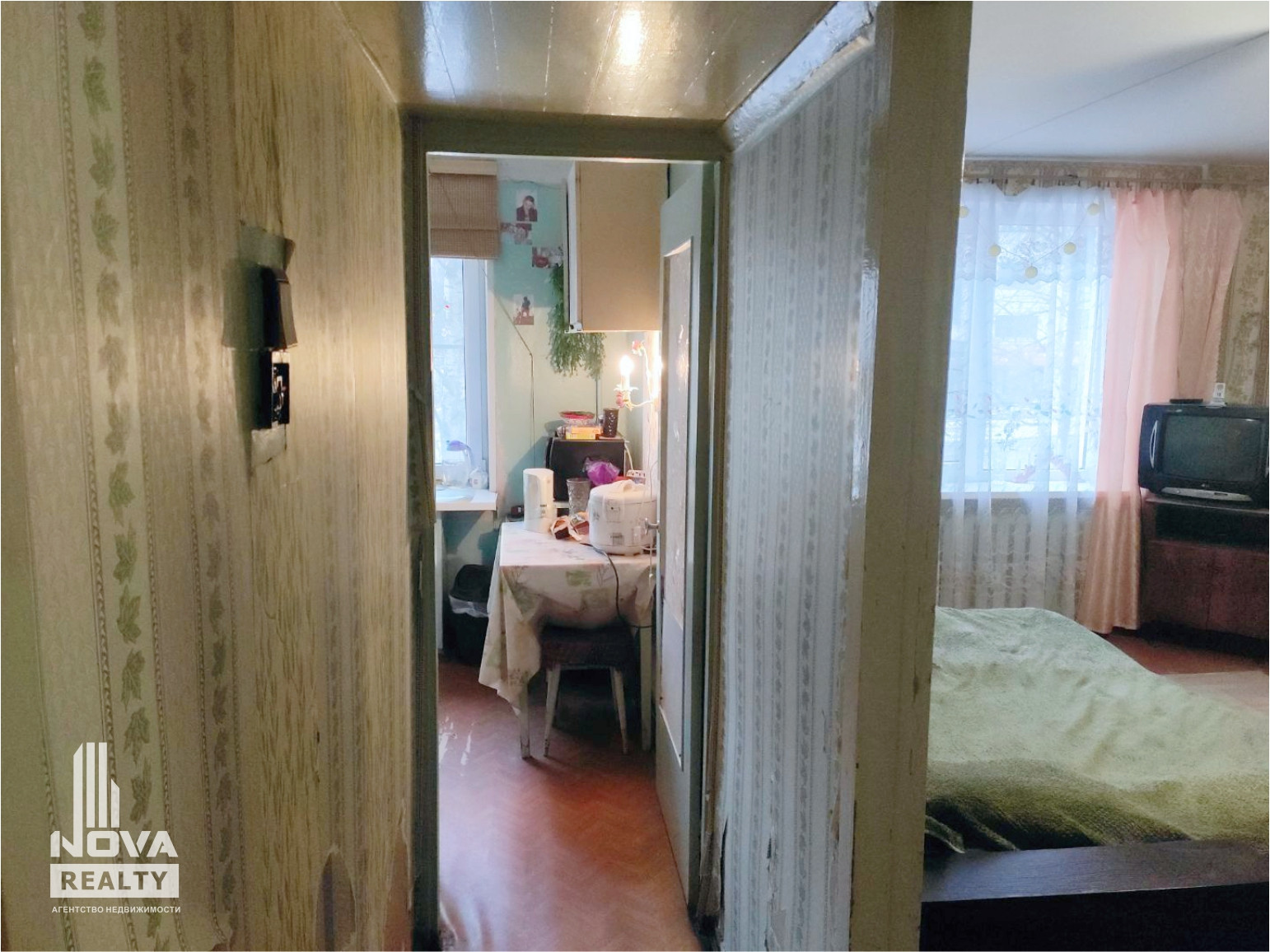 Светлые просторные комнаты,  окна выходят на солнечную сторону.  Есть возможность сделать пререпланировку, соединив кухню с гостиной, либо сделать комнаты раздельными.